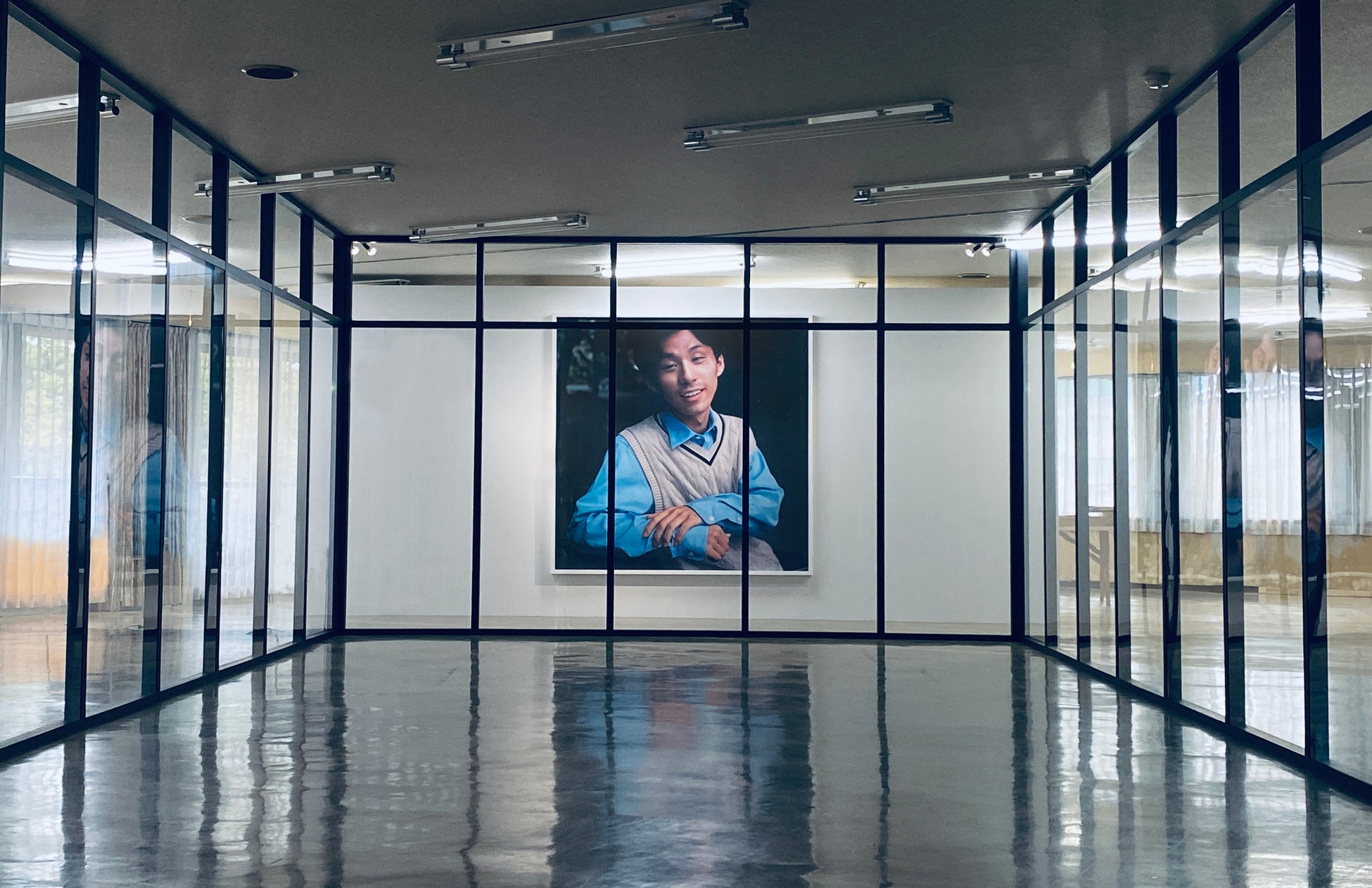メイン会場に設置された透明版による会場導線。建物の外から中へと観客を誘い、時に展示空間を分断/接続させながら会場全体に展開される。導線の構造となるフレームは「窓」の機能を持ち、その向こう側に広がる何気なく置かれた箒や塵取りなどの日常的な光景を、あらためて「みる対象」に置き換え、ひとつの「景色」としてわたしたちに対峙させる。