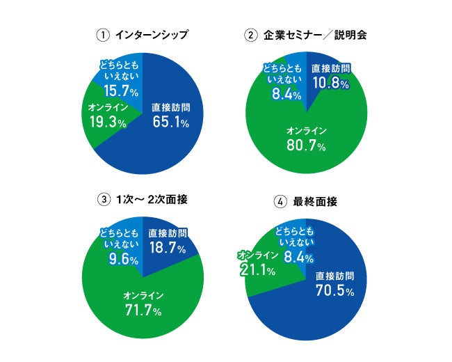アフターコロナでインターンシップに臨む場合、65.1%の学生が直接訪問を希望。一方で、企業説明会や一次面接についてはオンラインを希望する学生が逆転。