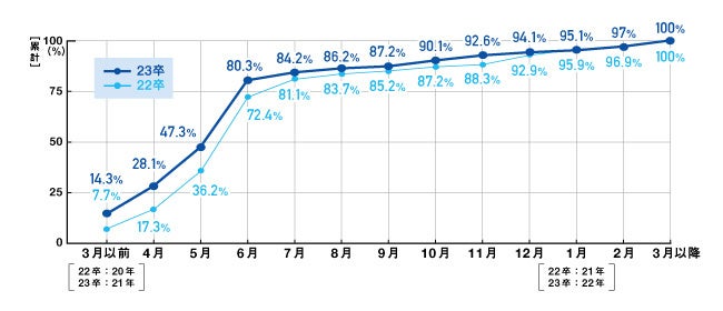 23卒就活生の就活開始時期は2021年4月時点で28.1%(前年比10.8 ポイント増)と早期化が進む。