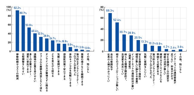 オンライン就活で学生が最もメリットを感じているのは「移動時間やコストの削減(92.2%)」。デメリットについては、「会社の雰囲気や社員の人柄がわかりにくい(69.3%)」が最多。オンライン上で得られる情報の質と量に関する懸念の声が多く寄せられる。