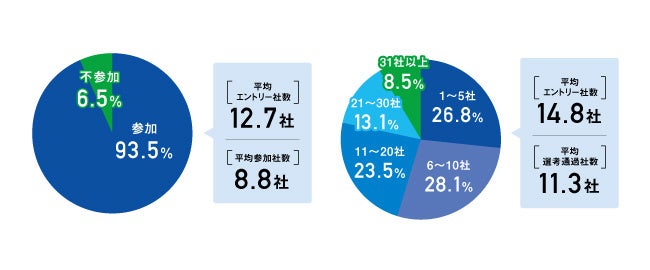 オンラインプログラムの充実もあってインターンシップ参加率は93.5%(昨年比1.7ポイント増)に達する。本選考のエントリーシート提出社数は14.8社(昨年比1.1社増)。