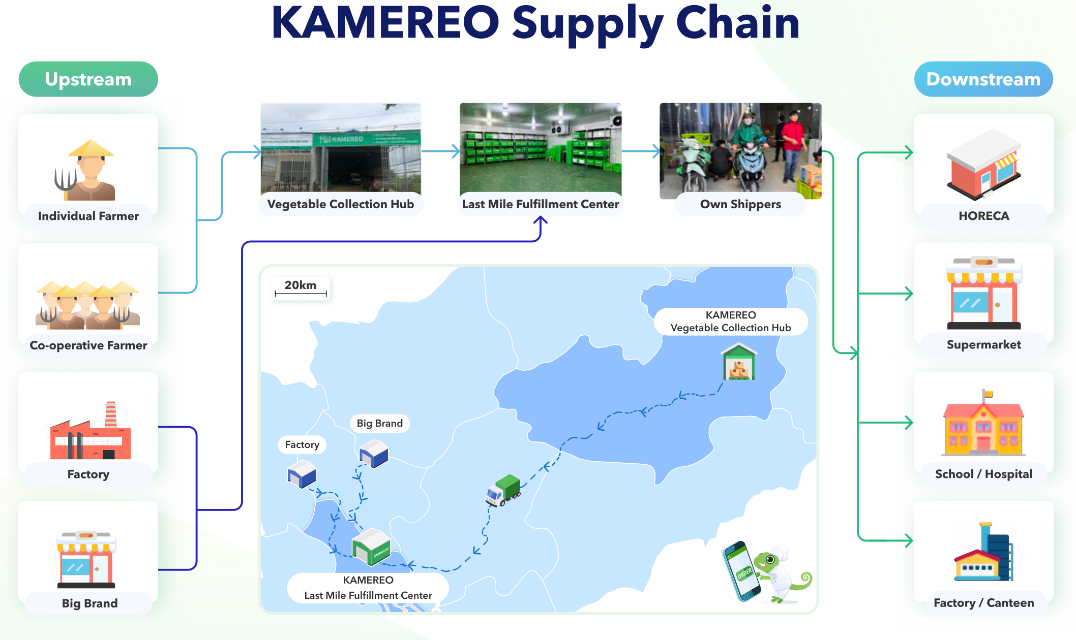 KAMEREOは、ベトナムの事業者向けに野菜を中心とした食材の卸売事業を運営するスタートアップ企業です。自社で農地が集積するエリアに野菜の集荷場を持ち、100を超える契約及び提携農家と協業し、川上から川下の顧客までのサプライチェーンを全てコールドチェーンにて自前で構築しています。また、社内エンジニアチームが顧客が発注するモバイルアプリとWebサイトの開発、発注後の倉庫及び配送管理システムを開発することでコストの効率化とミスの軽減を実現しています。ベトナムの食のサプライチェーンは多重構造かつ全ての事業者が小規模であるため、非効率性が極めて高い状況です。KAMEREOは自社でより効率的なサプライチェーンを作り上げ、顧客に安価、安定、安心供給が提供できる体制を構築しています。現在、日本人1名、ベトナム人社員約200名で事業運営をしており、ベトナムの3,000を超える事業者にサービスを毎月提供しています。