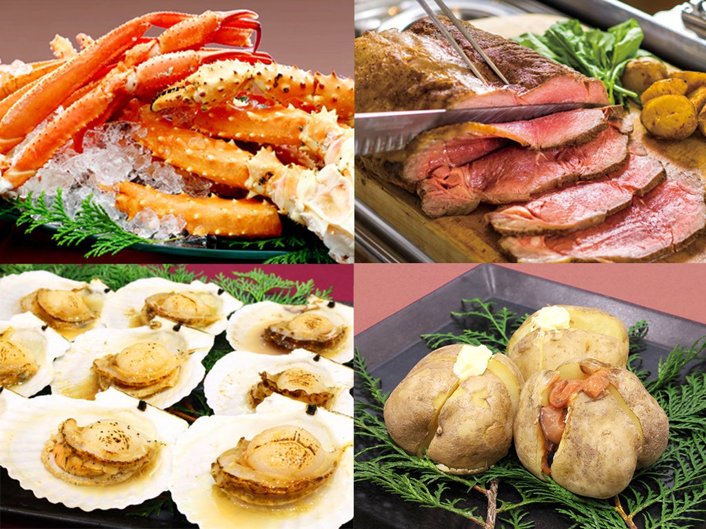 食べ放題の蟹の食べ比べやオホーツク海鮮丼などの魚介、各種の肉料理、赤肉メロン入りフルーツカクテルや野菜など、北海道の海と大地の恵みを満喫してください。