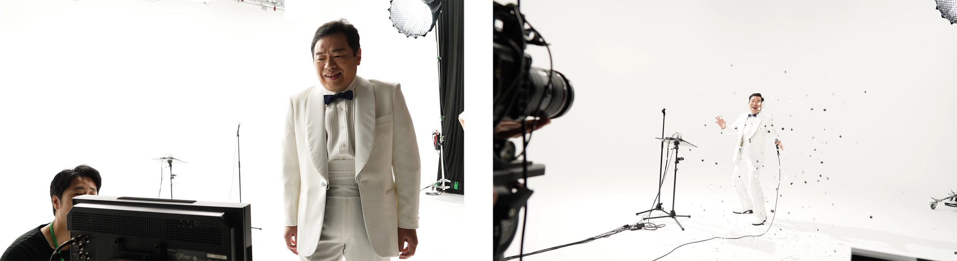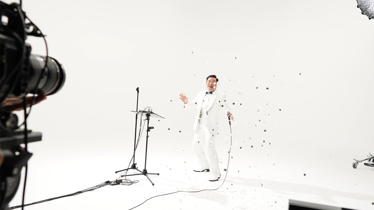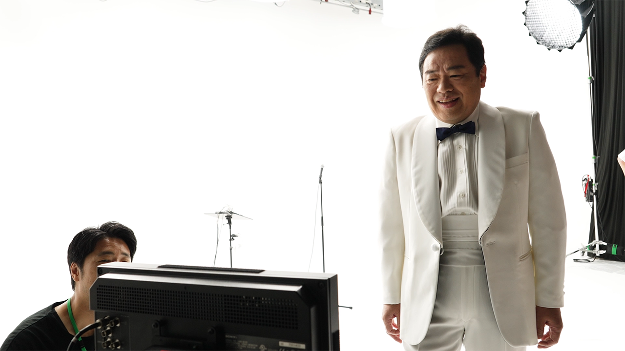 一方、面白くするための演出にも本気のグッチ裕三さんは、事前に銀吹雪の紙質やポケットに入れる量、ポケットの深さなどを入念にチェックしたり、マイクにぶつかるシーンのためにマイクを浅くセットしたりと準備を徹底。さらに派手にしたいと考えた現場スタッフの発案にも快く応じてくださり、当初の予定にはなかったターンの演出をその場で採用しました。「ターンの際にヘッドホンが引っかかってしまうかも」と不安を口にしながらも本番は一発で成功。カットの声がかかるとご自身でも思わず笑ってしまうほどウィットに飛んだ仕上がりになり、現場も笑い声溢れる和やかな雰囲気となりました。