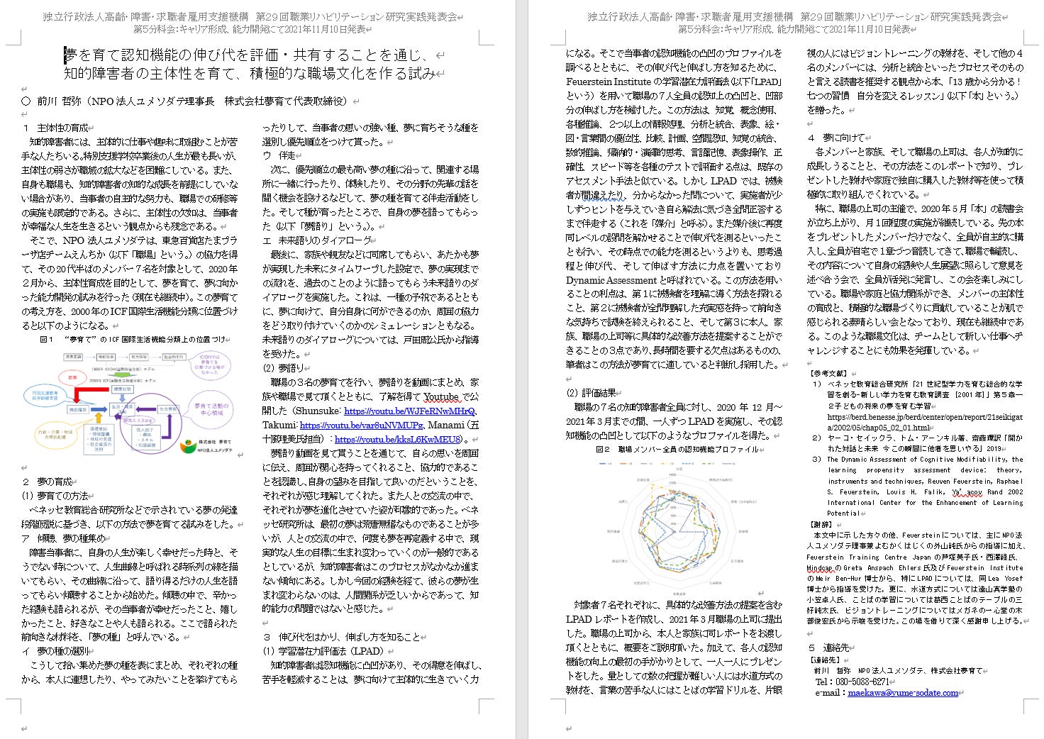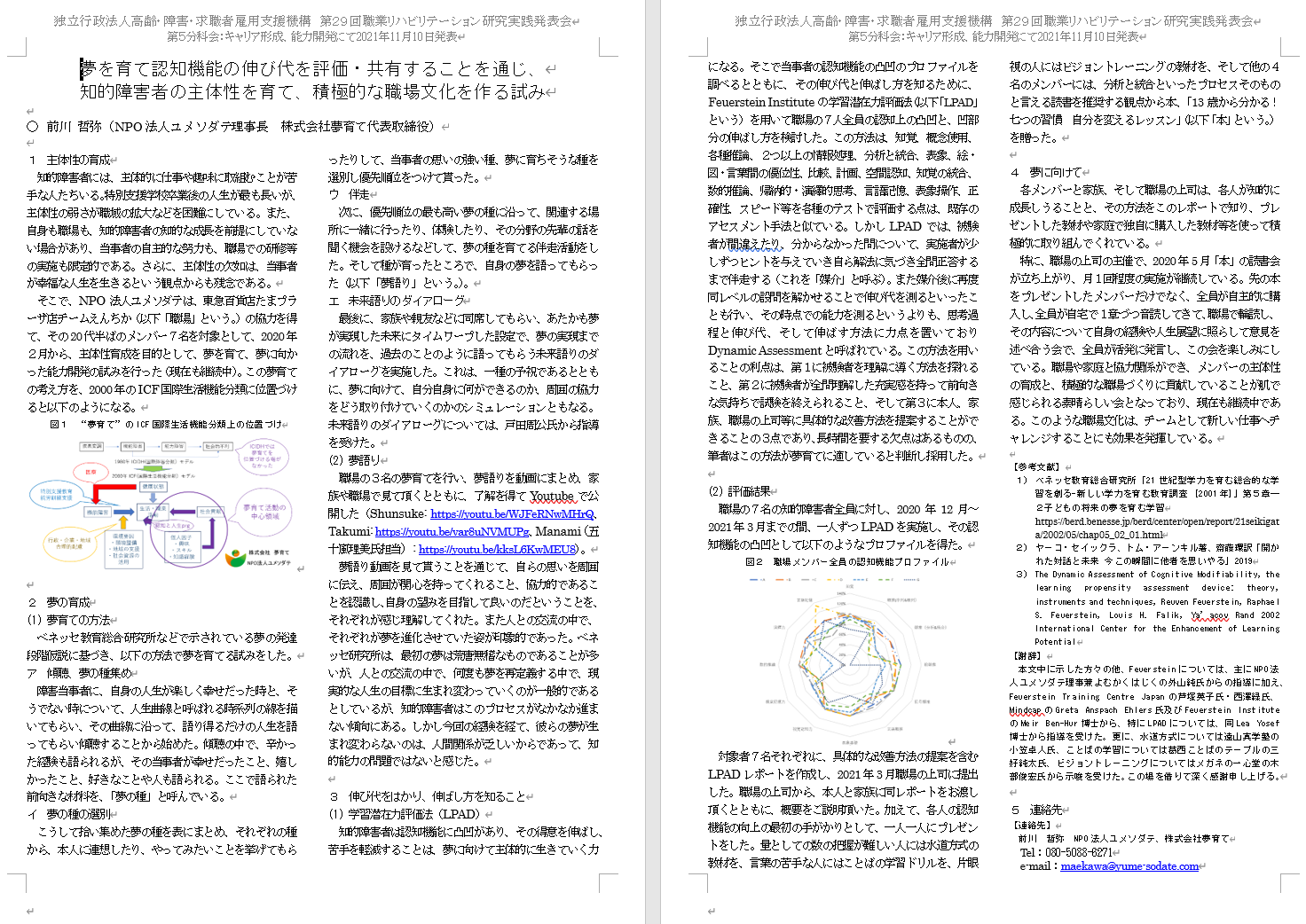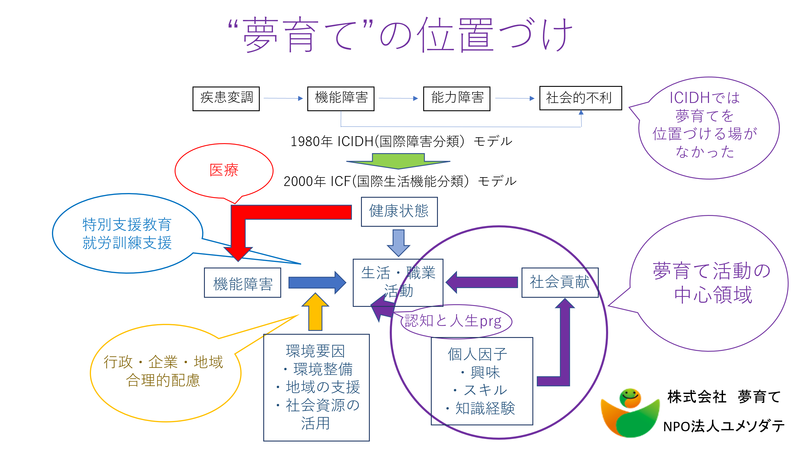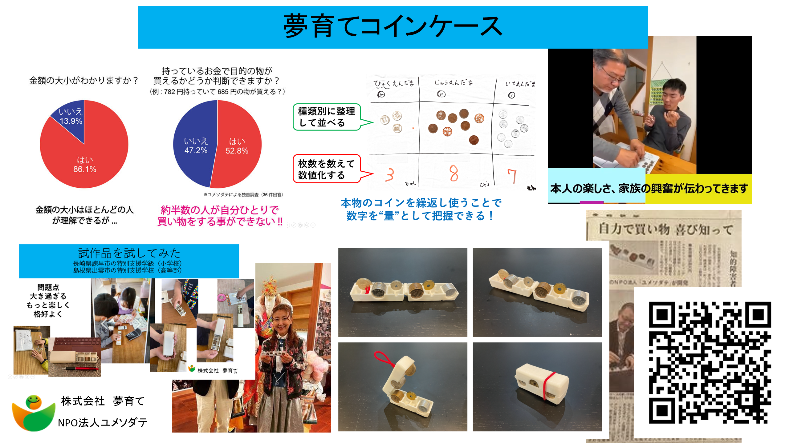 障がいのある人に夢や希望を持って、主体的に社会と関わりながら生きて頂けるよう伴走する夢育て事業をしています。(2021年の高障機構の職リハ発表をご覧ください https://yume-sodate.com/news/871/)また、夢に向けて、知的障がいのある人が認知能力を高めることを媒介する活動。例えば、202111-202201までReadyforにてクラウドファンディングを実施した夢育てコインケースの開発はその一つです。さらに、学齢期を過ぎても知的障がいの人たちが働く中で能力開発が行える方法を探ったり、全国の事例を収集したりする農福連携事業を計画中です。