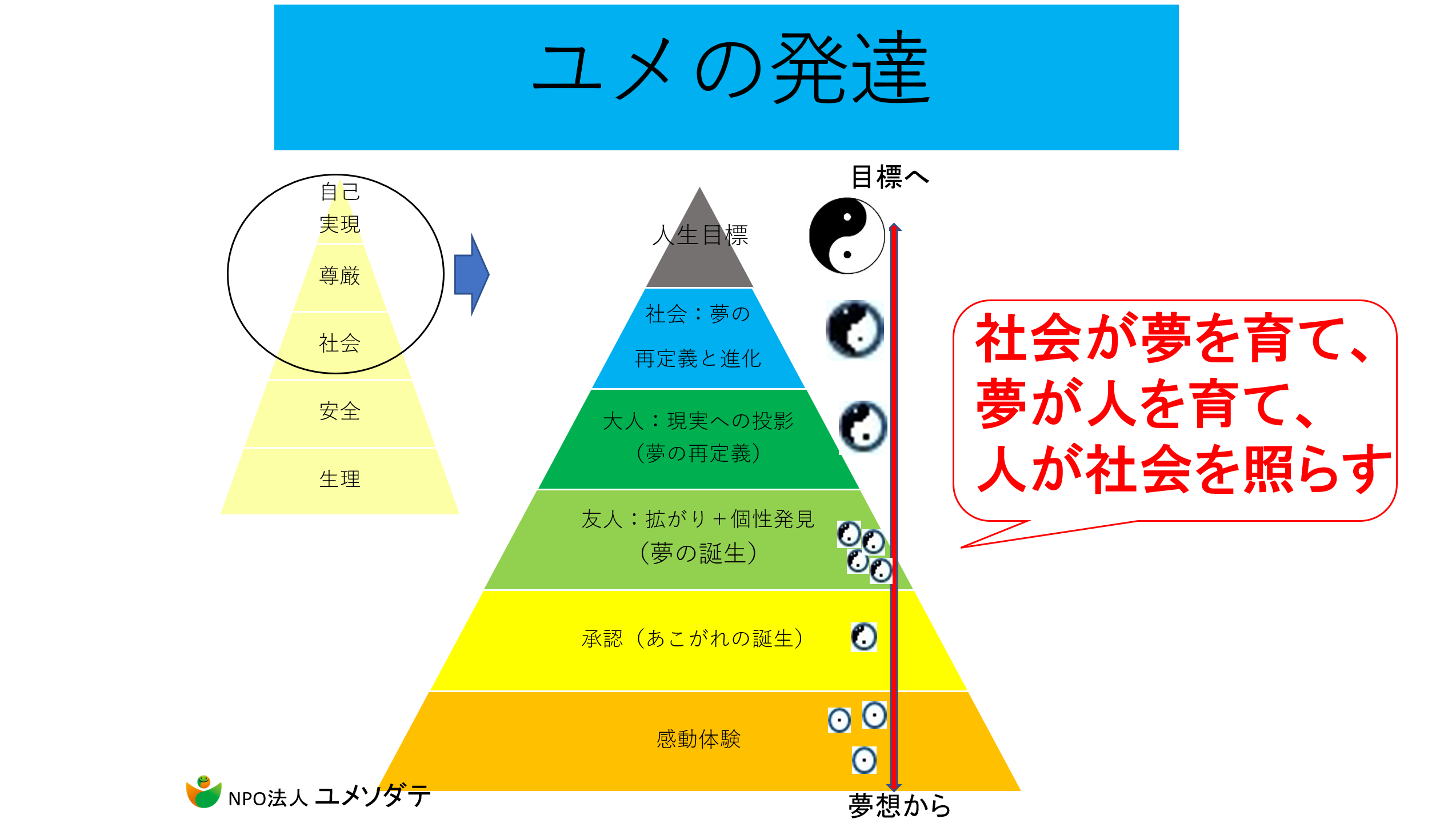 夢は、ちょっとした感動体験を身近な大人に語ることから始まります。夢を人に語る勇気を持ち、人の夢を聴くことで個性に気づき、様々な交流の中で社会を垣間見、荒唐無稽な夢に段々と現実味が加わっていき、人生の目標へと育っていきます。