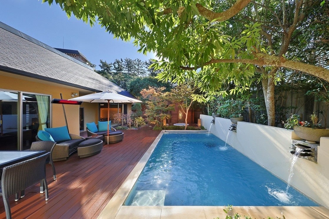 各邸約120坪の広々としたプライベート空間に、平屋一棟建て房州グランジ造りのゲストルーム、鴨川温泉・潮騒の湯が楽しめるかけ流しの露天風呂にプライベートプールや専用ブロアバス、ガーデンデザイナー玉井禎晋氏による和洋さまざまなエッセンスを取り入れたスタイリッシュな庭園を備えています。