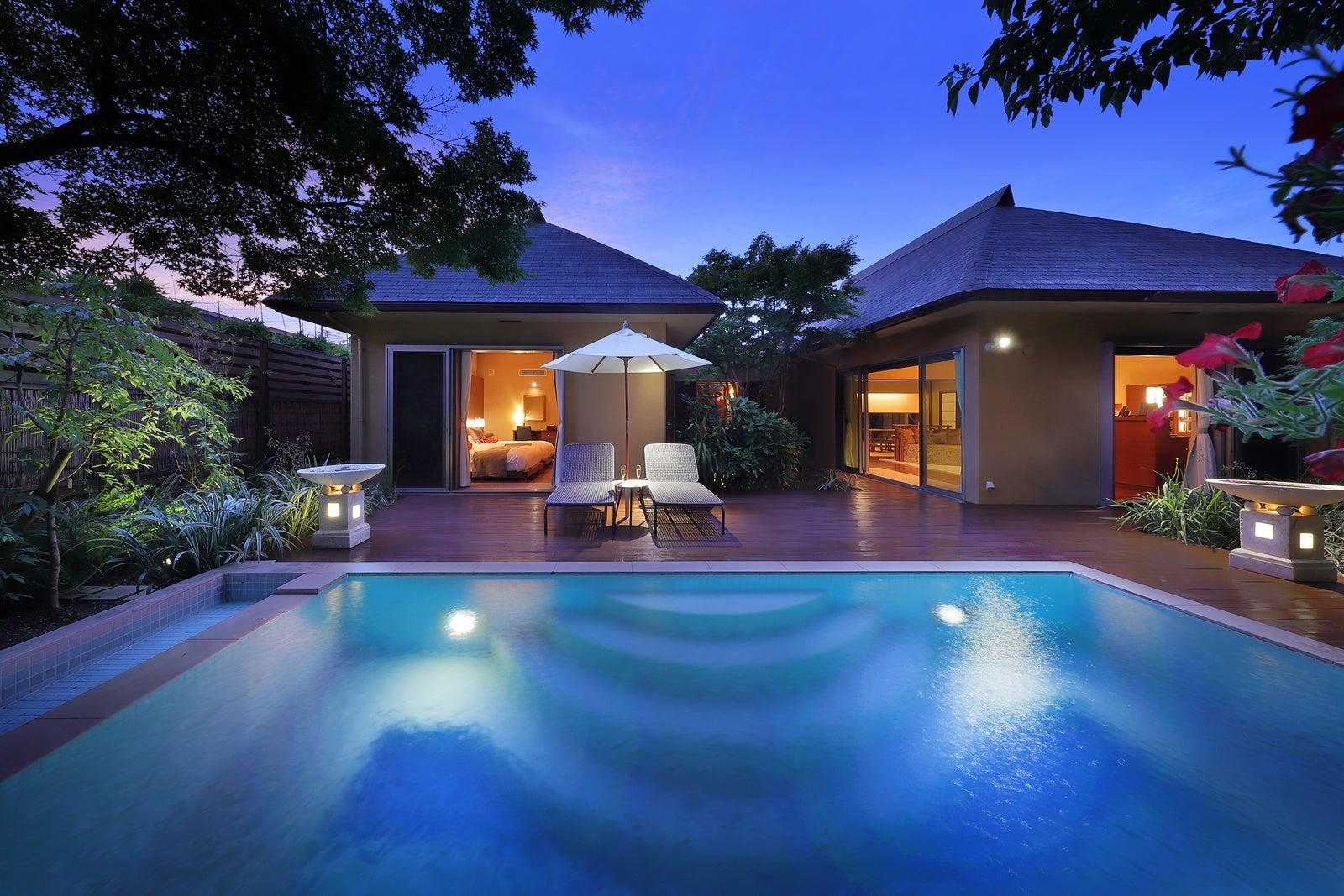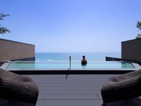 各邸400㎡、平屋一棟建ての広々としたプライベートヴィラ。わずか5棟のみの特別な空間には、114平米のゲストルームとかけ流しの客室温泉露天風呂、そしてテラスづたいに楽しめるプライベートプールやブロアバスを完備。松林を通り抜ける潮風を感じながら、贅沢極まる大人の休日が始まります。