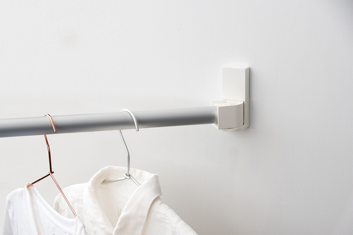 左右に60度ずつ首が振れるため、斜めに竿を渡せます。省スペースにもダイナミックにも使えて、突っ張り棒を諦めていたスペースも有効に使えます。置き型物干しのように床にスペースを占領しないところもポイントです。