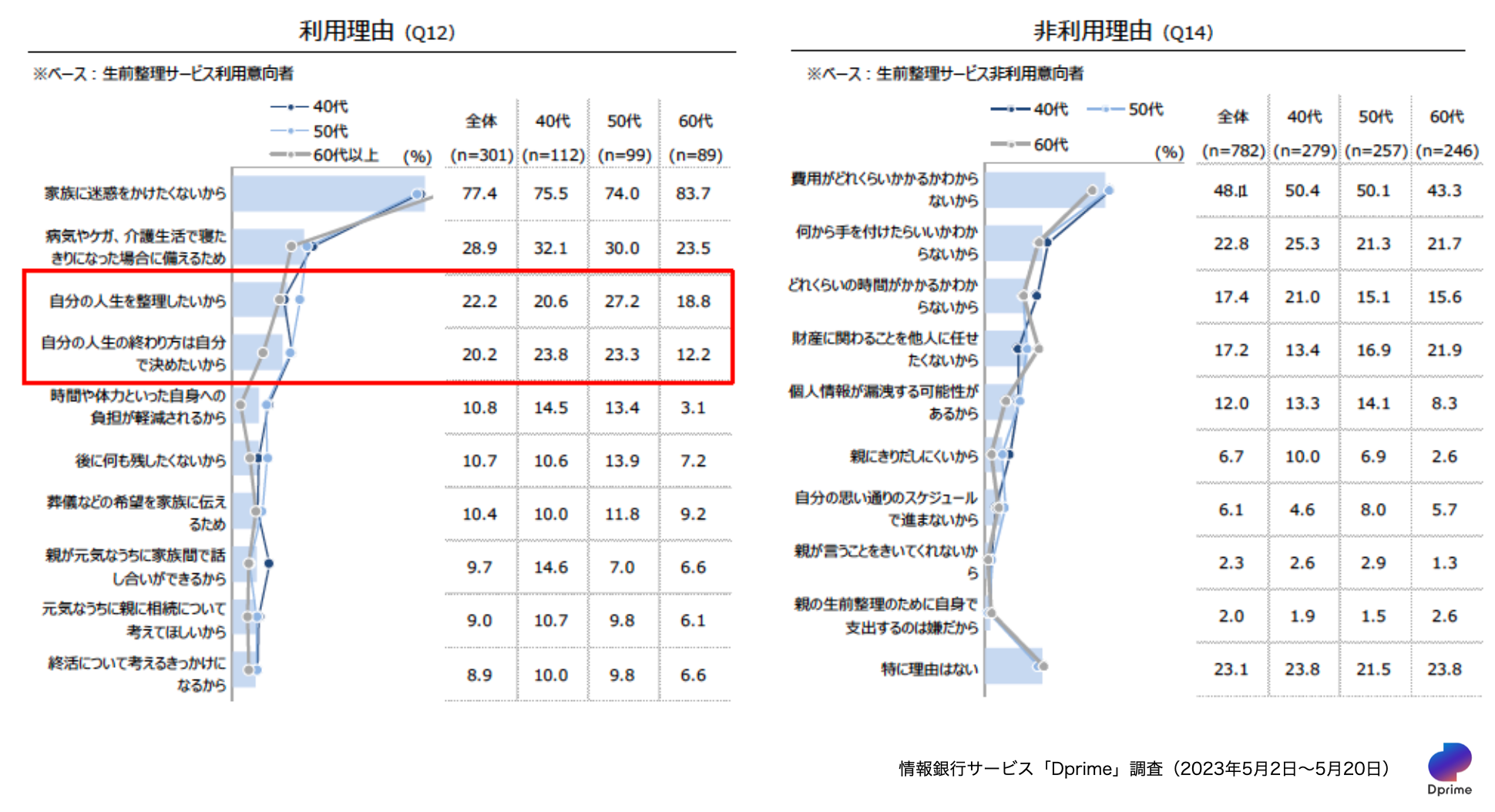 「生前整理サービス」の利用理由は、全年代において「家族に迷惑をかけたくない」が突出して多い。50代は「自分の人生を整理したい」「自分の人生の終わり方を自分で決めたい」の割合が他の年代よりも高く、「自分」を重視する傾向が強い。
