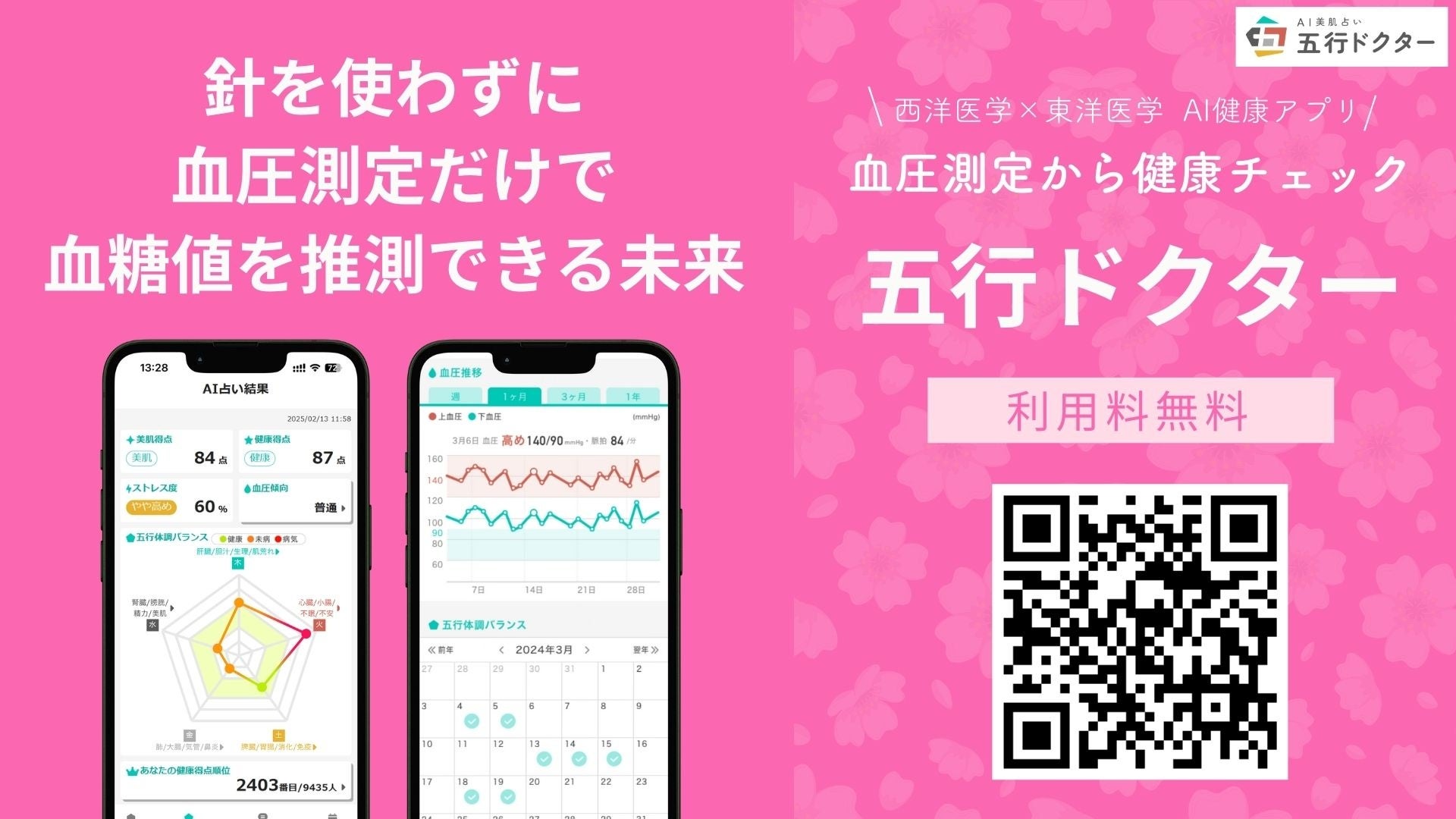 『五行ドクター』は、血圧測定データをもとに、ユーザーの体調・肌・ストレスの傾向とあわせて、その日の“未病”や健康・美容改善のアドバイスを東洋医学(五行理論)に基づいてお届けするWEBアプリです。