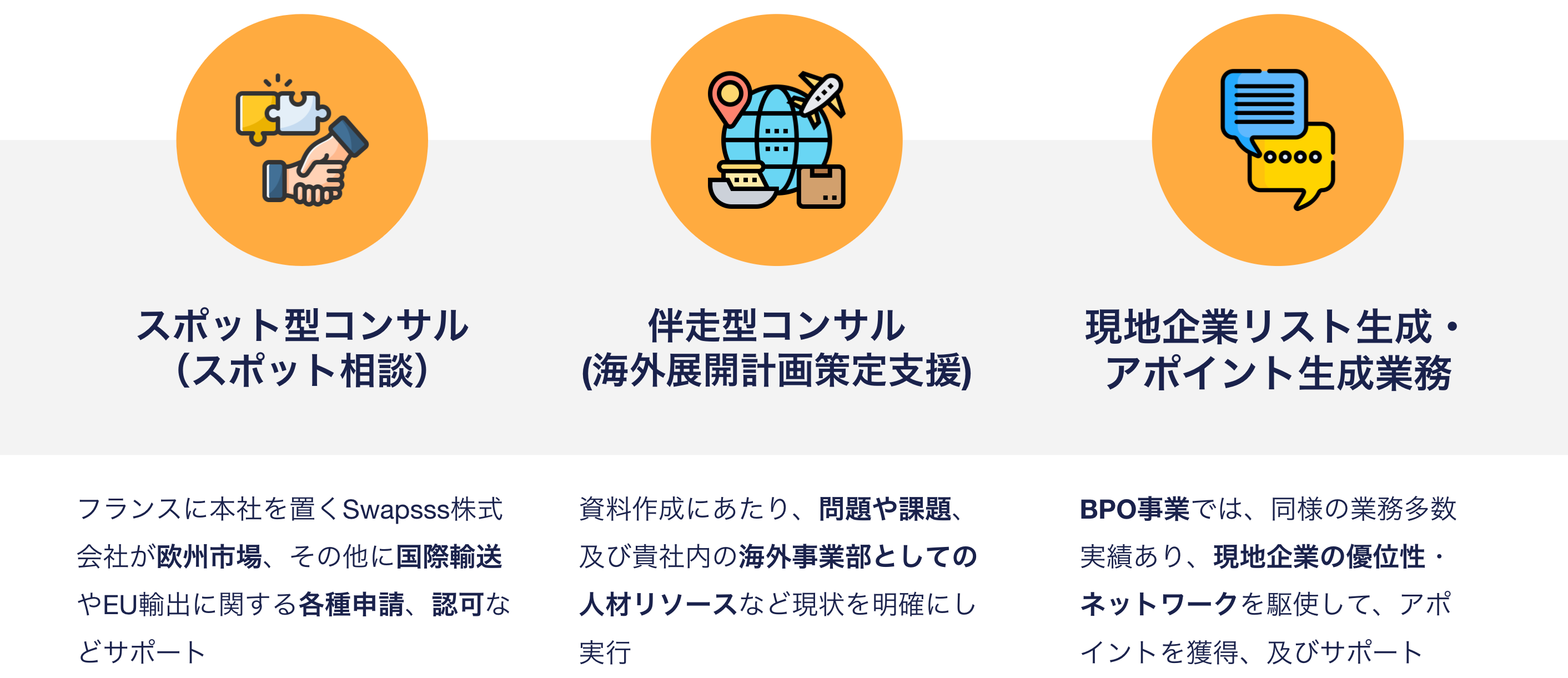 フランスに本社を置くSwapsss株式会社は、欧州市場(特にフランス・ドイツ)に進出する企業を総括的なビジネスモデルでサポートします。