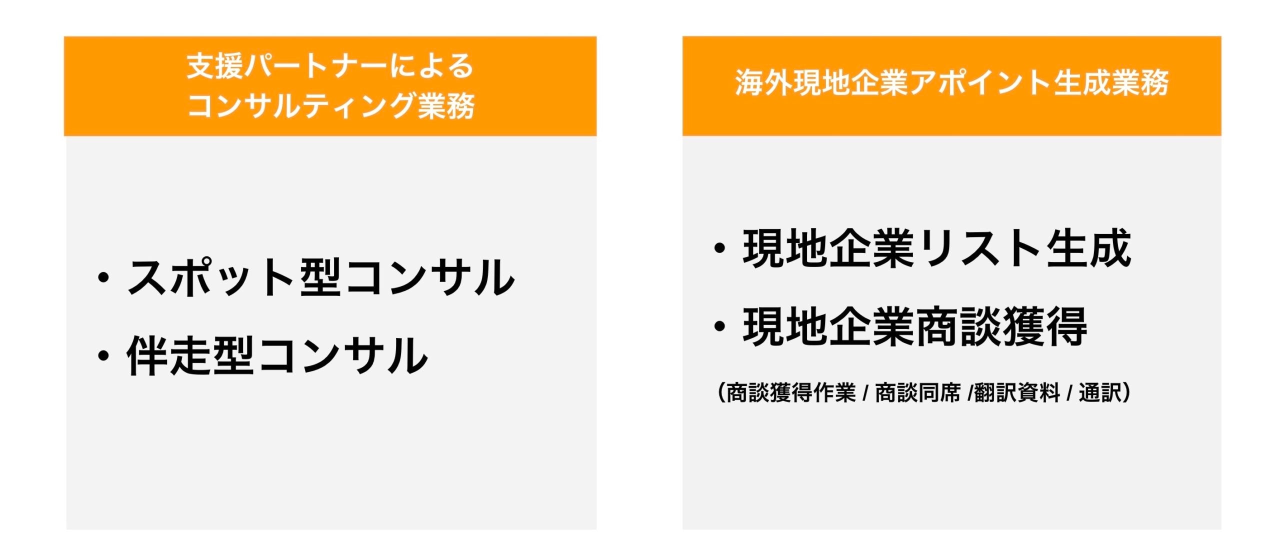 以下、2種類の海外展開支援を実施するため、本事業に選定された支援パートナーを活用して、 札幌市内企業の海外展開を促進