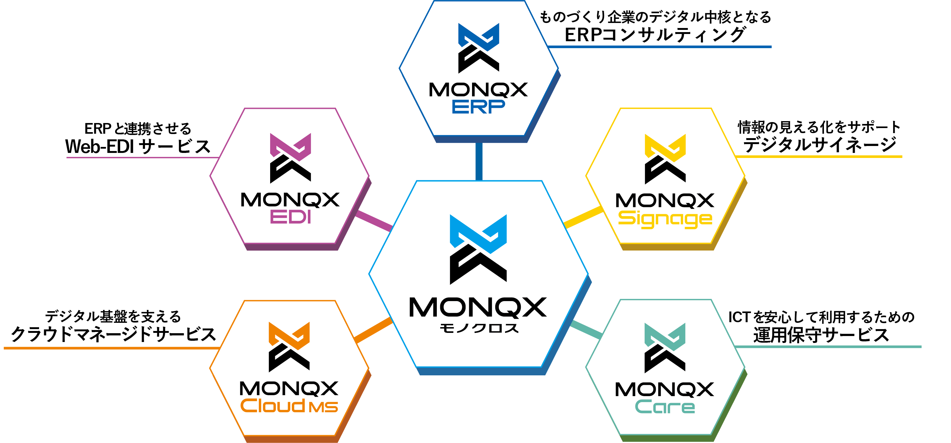 複雑化する製造業のお客様を取り巻く環境に対して『ものづくりDXブランド「MONQX (モノクロス)」』をはじめとする、ものづくりDXを支える仕組みとなるサービスを取り揃えています。