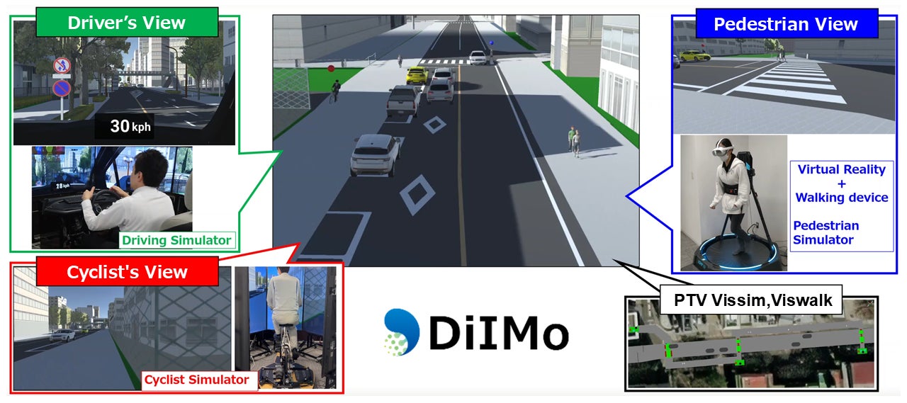 DiIMoはインタラクティブなマルチシミュレータで、同じ仮想空間内で歩行者やドライバーなど異なる役割を体験することができます。名古屋市や豊田市など、現実の街並みを再現したダイナミックな交通環境の中で、複数のユーザーが対話することができます。このシステムは運転と歩行の特性を測定し、より人間中心のモビリティ・ソリューションの開発に利用できるデータを収集しています。