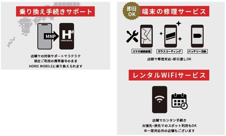 全国170箇所あるエックスモバイル店舗で乗り換え手続きや、端末修理サービスなど各種サポートが受けられます。また、店舗では、出張先・旅先でのスポット利用もできるレンタルWi-Fiサービスも提供しています。
