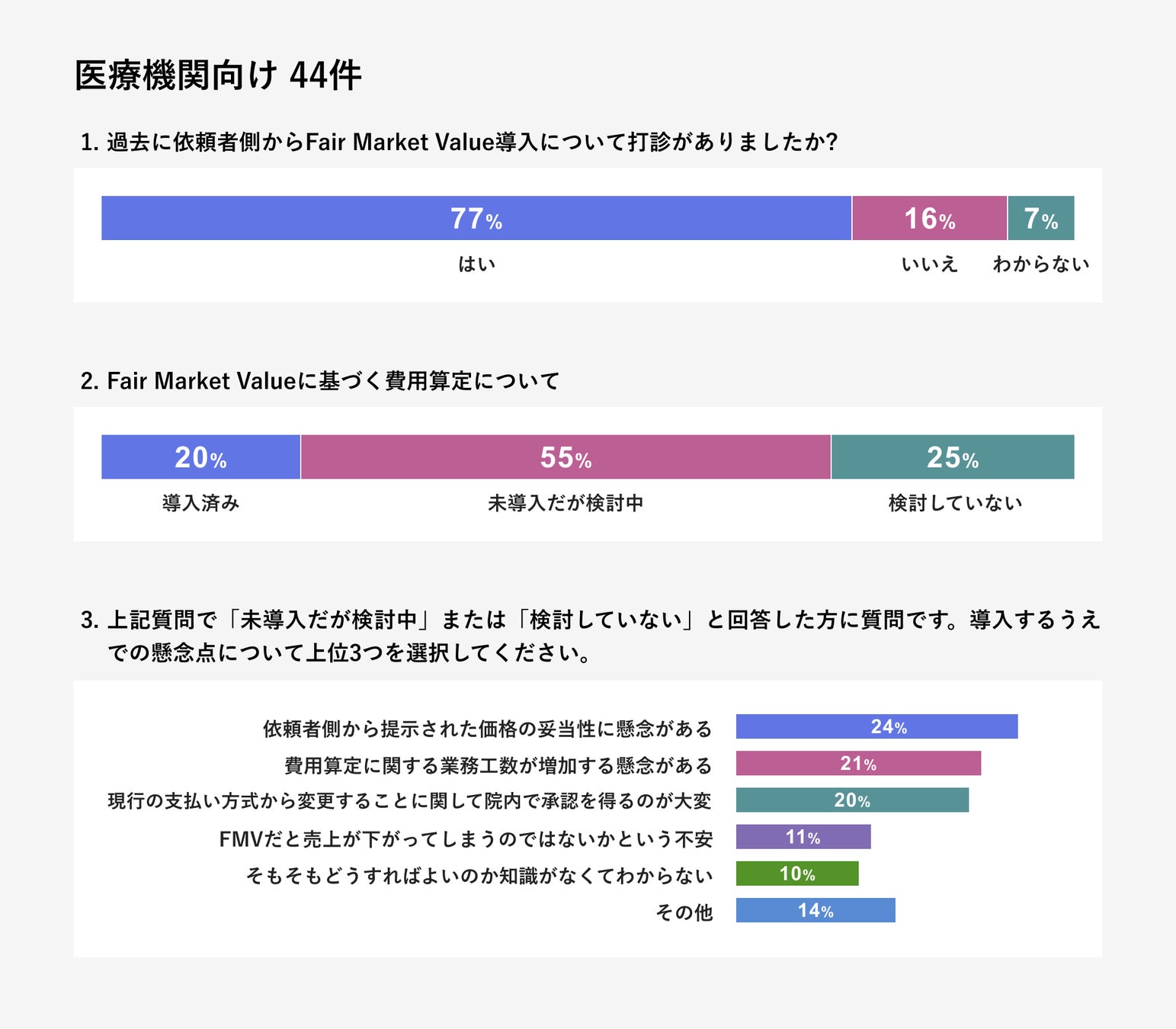 医療機関向けアンケートでは、多くの施設(77.3%)が依頼者からFMV導入の打診を受けている一方、導入済みは20.5%にとどまっています。ただし、検討中の施設が約半数(54.5%)存在するため、今後導入が広がる可能性があることがわかりました。課題としては、「依頼者から提示された価格の妥当性に不安がある」(52.3%)が最も多く、施設側への理解を深める取り組みが重要であることが明らかになりました。また、「費用算定に関する業務工数の増加懸念」(45.5%)も多く挙げられ、効率的な運用設計が求められていることが示されています。
