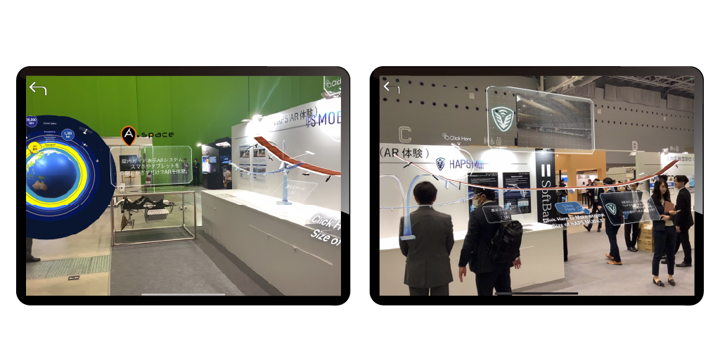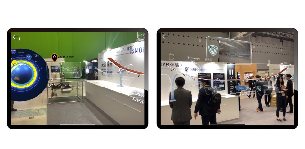 タブレットをHAPSの無人航空機「Sunglider(サングライダー)」の模型にかざすと、画面には実物大の機体(全長約80m)の3D模型や、地球の周りを飛ぶHAPS軌道のアニメーション、説明動画といったデジタルコンテンツがARで表示されます。