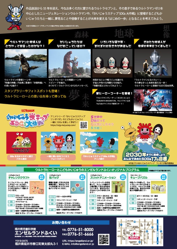 作品放送から55年を迎え、今なお多くの方に愛されるウルトラセブンと、その息子であるウルトラマンゼロを中心としたニュージェネレーションウルトラマンや、『かいじゅうステップSDGs大作戦』に登場するこどもかいじゅうたちと一緒に、夢見ることや想像することが未来を変える 「はじめの一歩」となることを考えます。