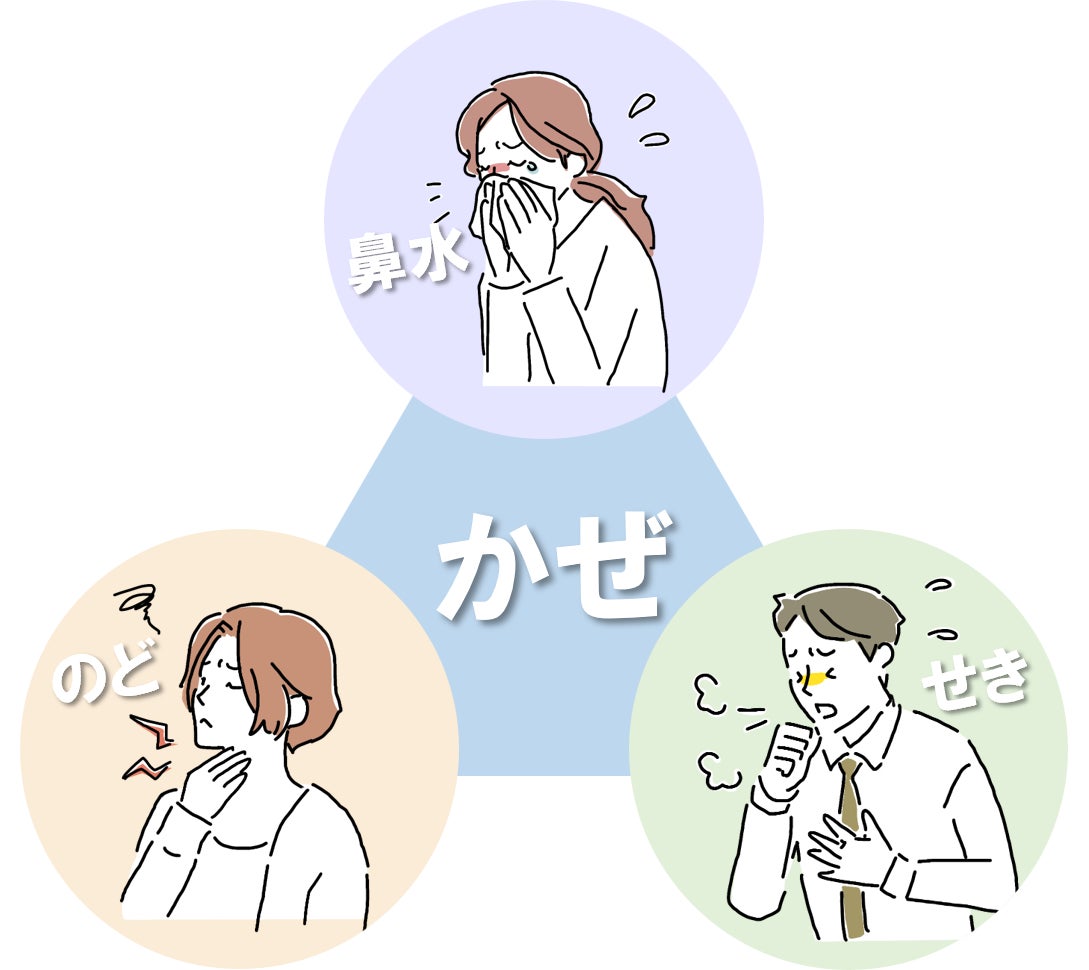 「かぜ」とは、「鼻水」 「のど」 「せき」 の三つの症状が同時に同じくらいの程度で存在する感染症のこと