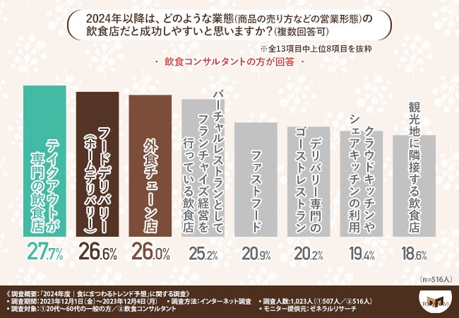 そこで、「2024年以降は、どのような業態(商品の売り方などの営業形態)の飲食店だと成功しやすいと思いますか?(複数回答可)」と質問したところ、『テイクアウトが専門の飲食店(27.7%)』と回答した方が最も多く、次いで『フードデリバリー(ホームデリバリー)(26.6%)』『外食チェーン店(26.0%)』と続きました。