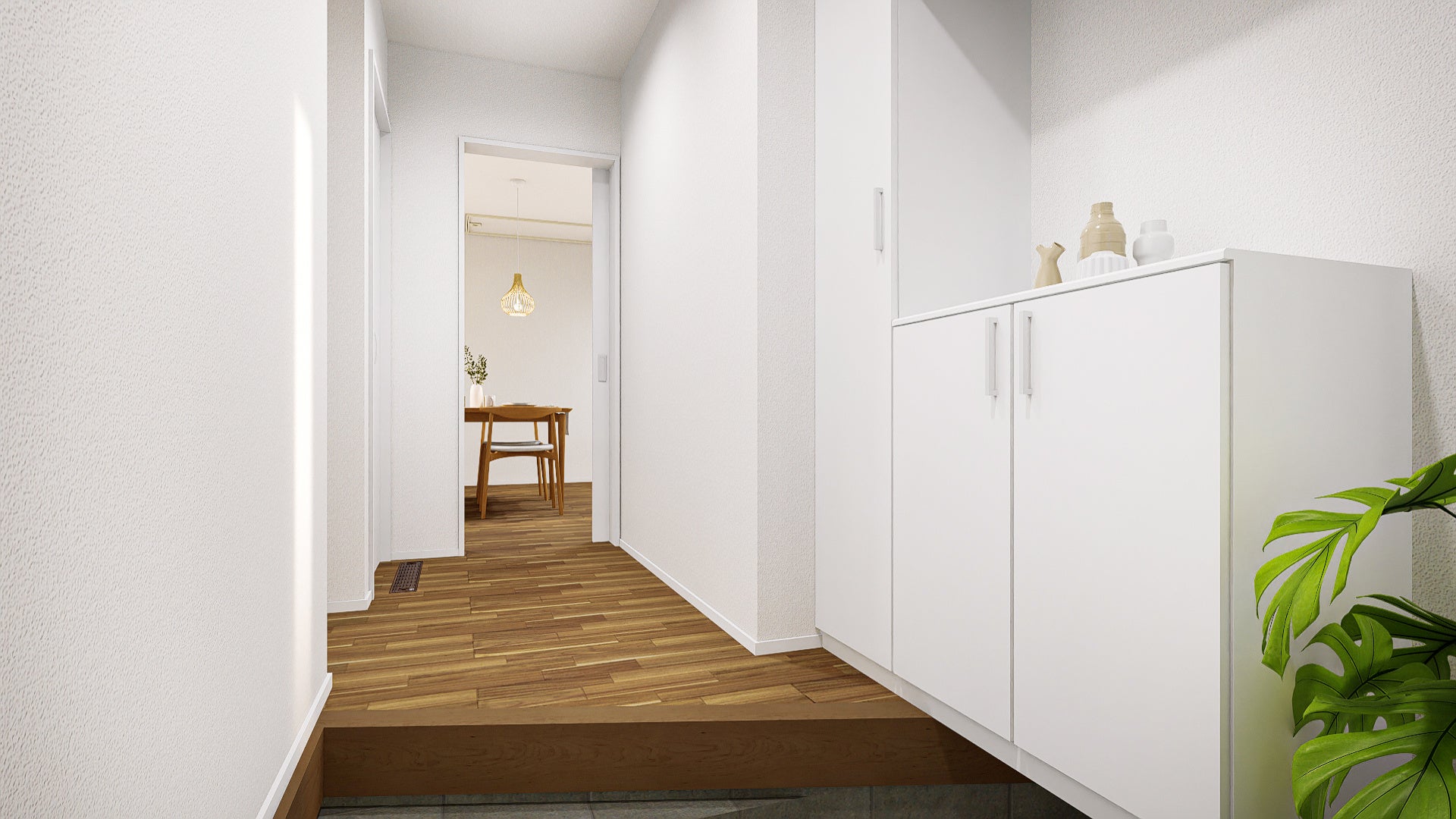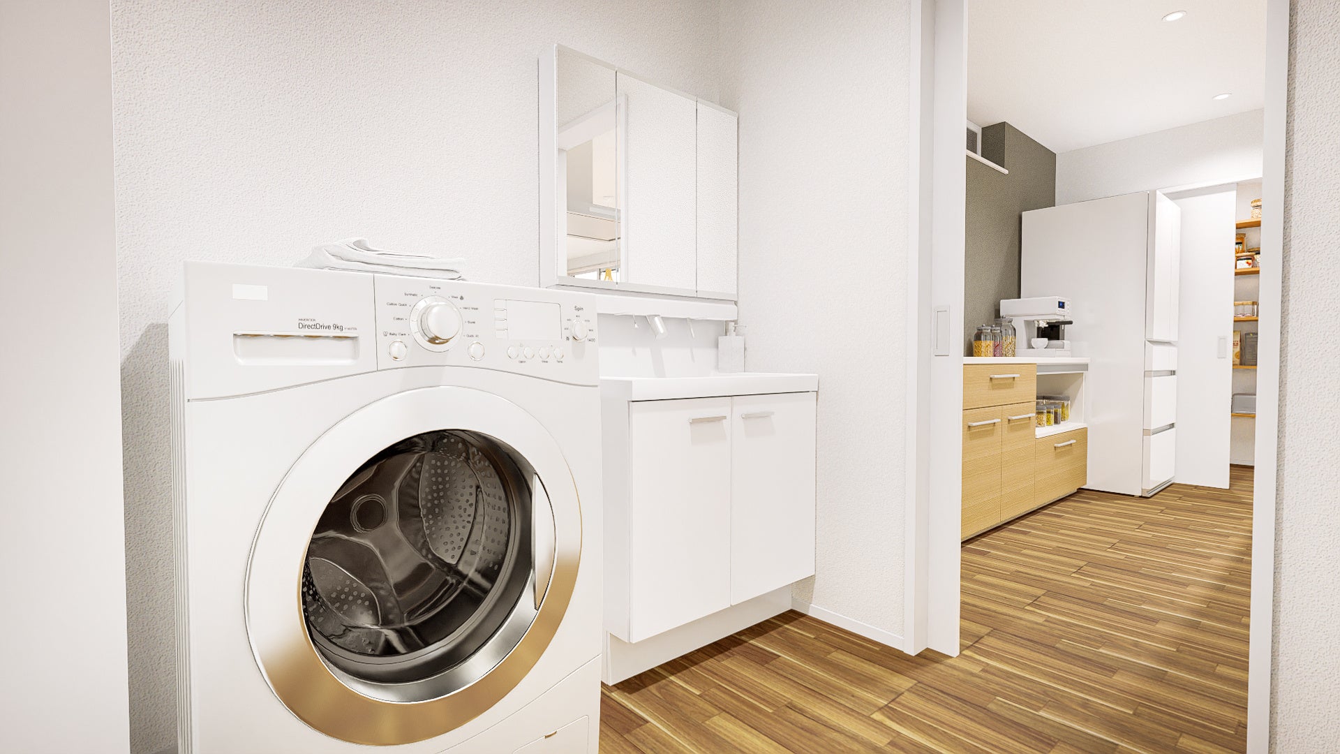 洗面脱衣室、キッチン、納戸とつながりを持たせることで、家事を行う際の移動距離が最小限になるように設計されています。また、玄関から直接水廻りに行けるようにすることで、作業で汚れていてもリビングなどを汚す心配もありません。更に、回遊動線なので、家族の間で渋滞することもなく、コンパクトでありながらも、ゆったりとした生活を送ることができます。