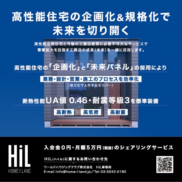WHCは、住宅業界が抱える様々な課題を解決すべく、各分野のエキスパートが集結した集団です。UA値0.46以下[6地域で断熱等性能等級6をクリア]・耐震等級3の高性能住宅として全てパッケージ化した“住宅キットをビルダー同士で共有できるシェアビジネス”で展開し、登録店は、自社ブランドとして販売・施工が可能となる「HOME i LAND(以下:HiL)」(通称ハイル)を運営。