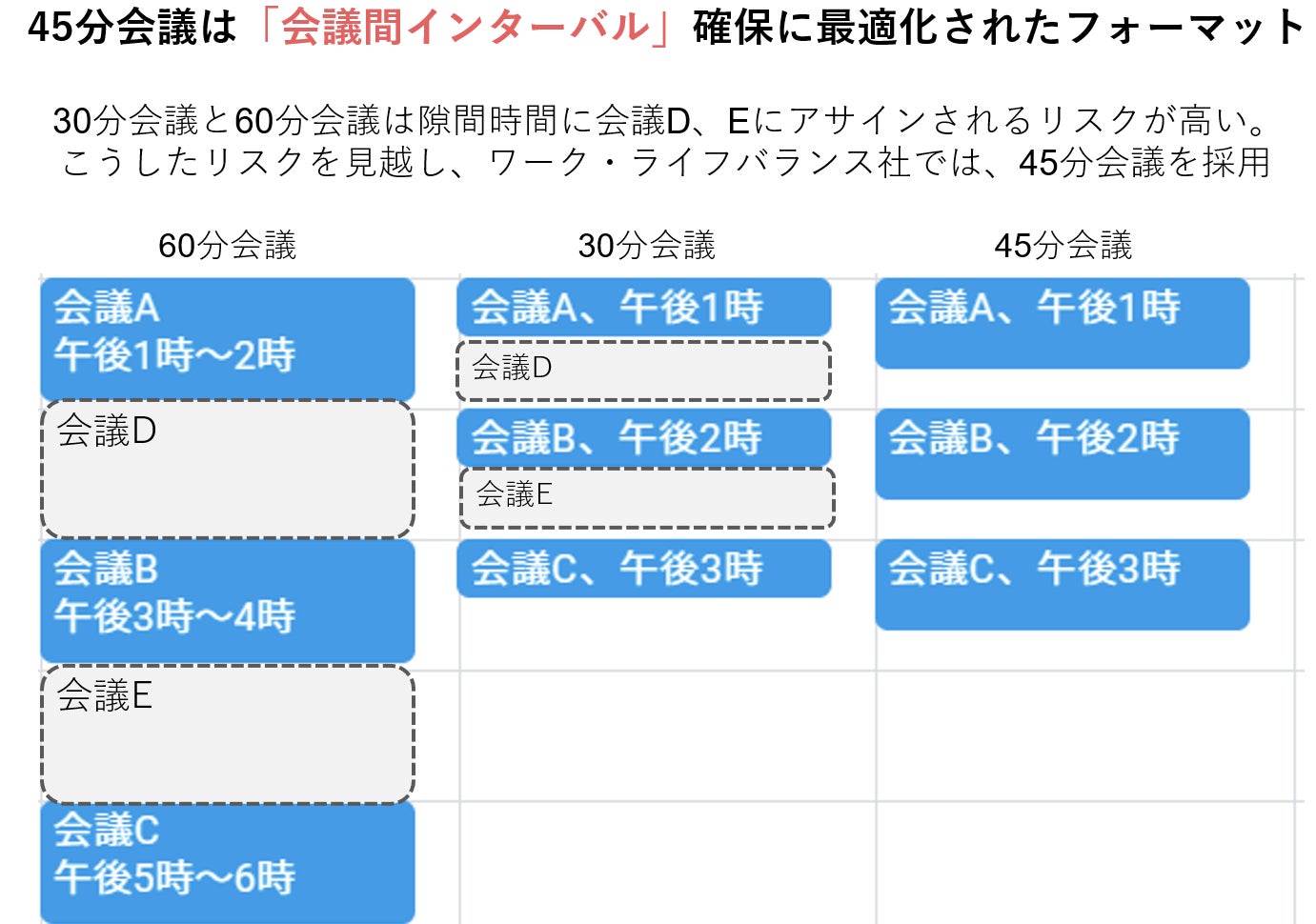 「会議間インターバル」の仕組み化として、ワーク・ライフバランス社が実践しているのが、45分会議です。