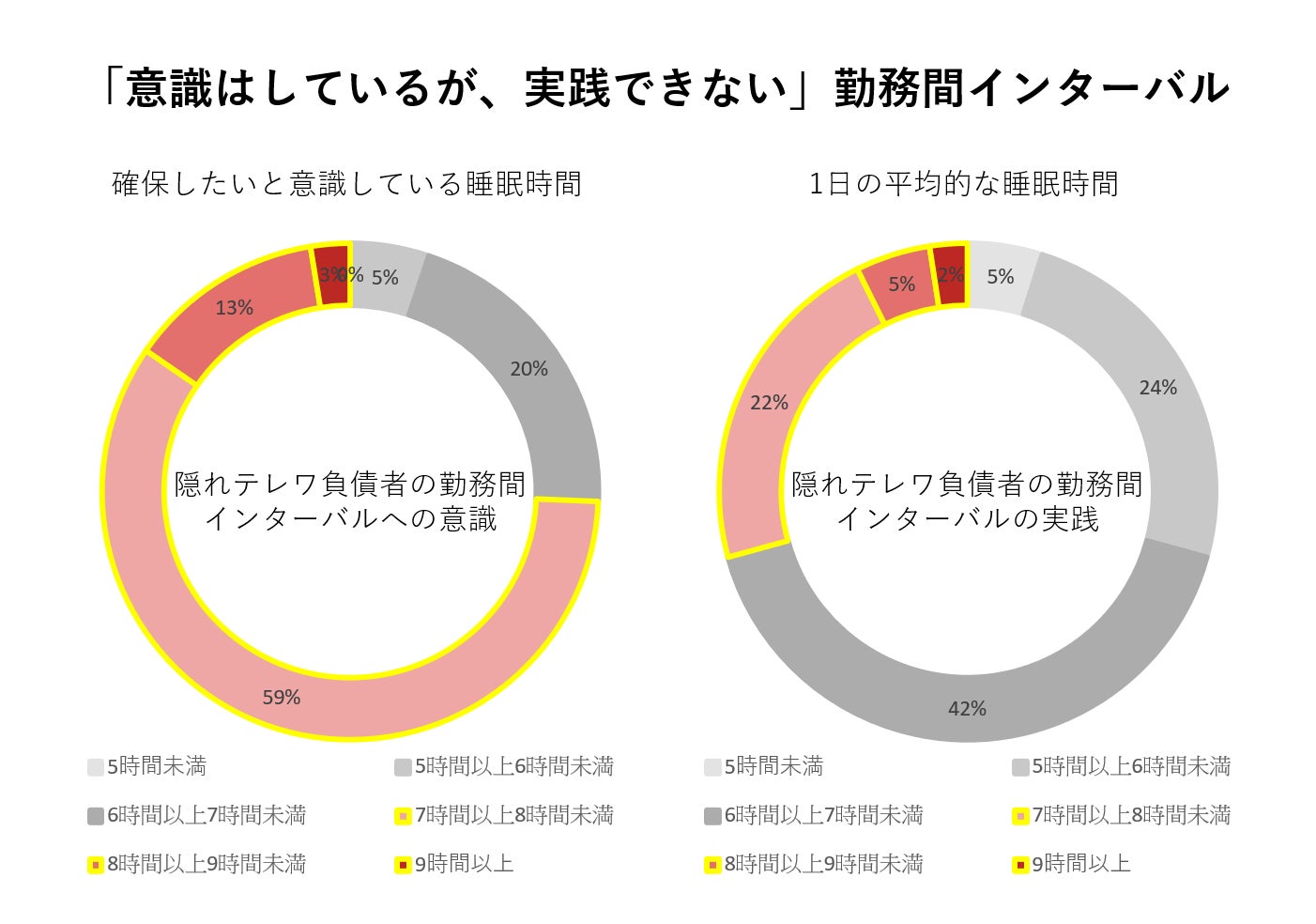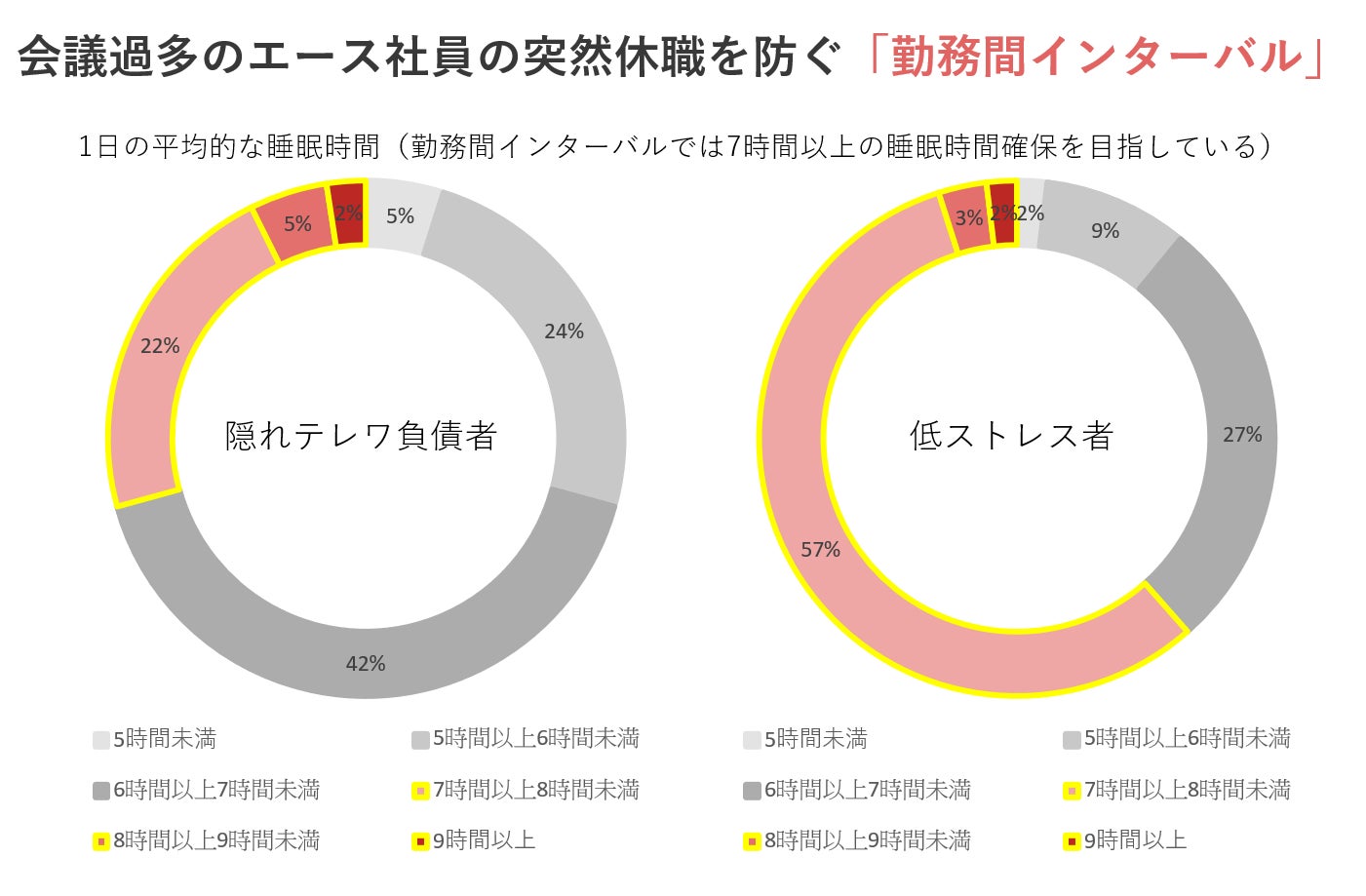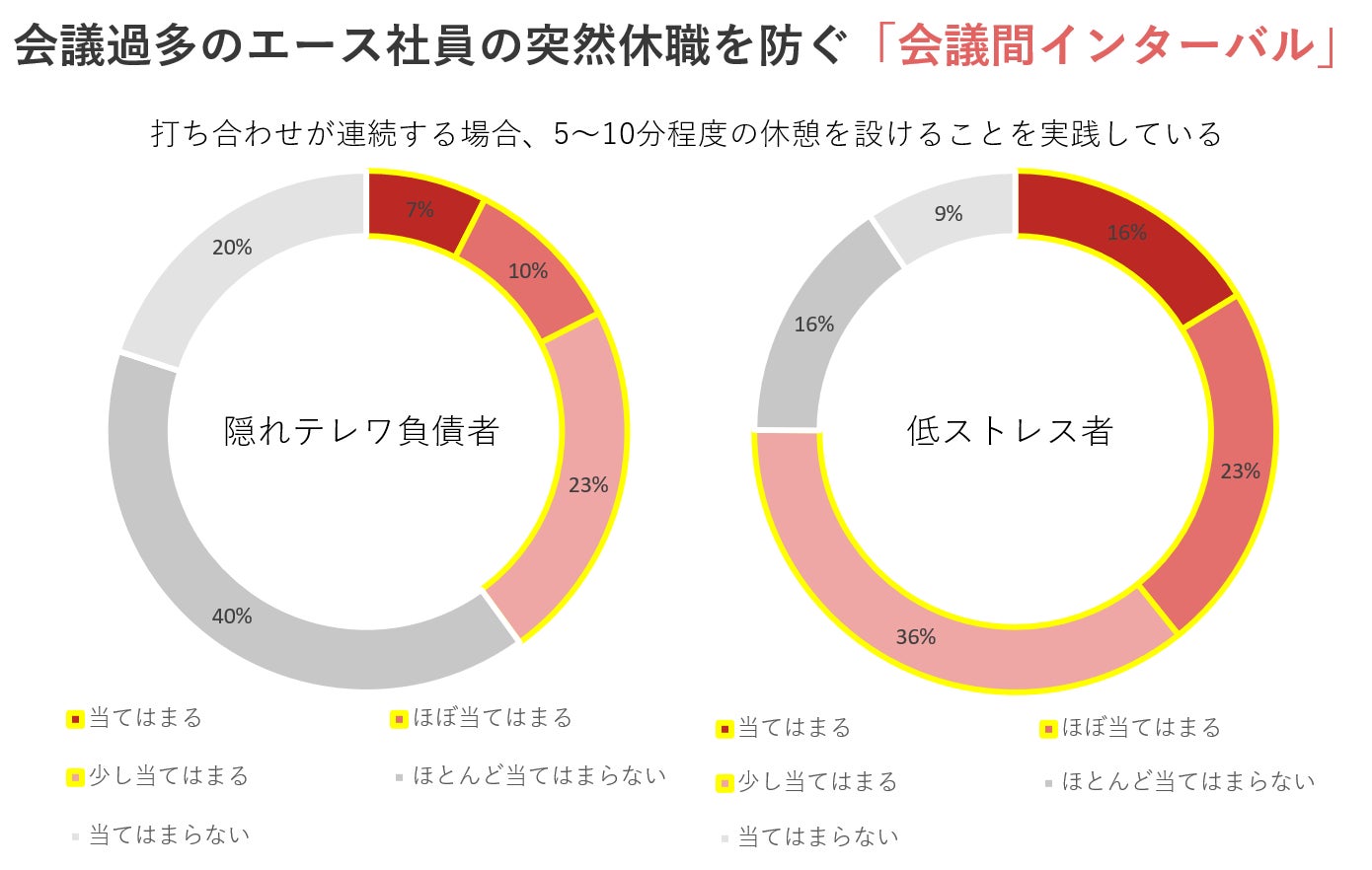 一方で、打ち合わせに次々とアサインされる中でも、突然休職のリスクを抱えていないエース社員も存在します。そうした低ストレス者と、突然休職のリスクを抱える隠れテレワ負債者の違いを分析した結果、会議が連続する場合の5分休憩「会議間インターバル」と、終業時間と始業時間を11時間以上空けることで、7時間以上の睡眠時間を確保する「勤務間インターバル」を実施しているか否かで、大きな乖離があることが明らかになりました。
