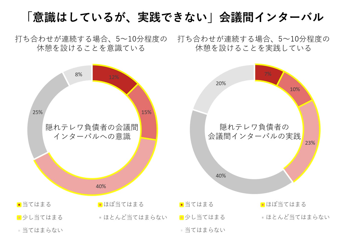 一方で、会議が連続する場合の5分休憩「会議間インターバル」と、終業時間と始業時間を11時間以上空ける「勤務間インターバル」を実施すると、隠れテレワ負債のリスクが低くなることも明らかになりました。