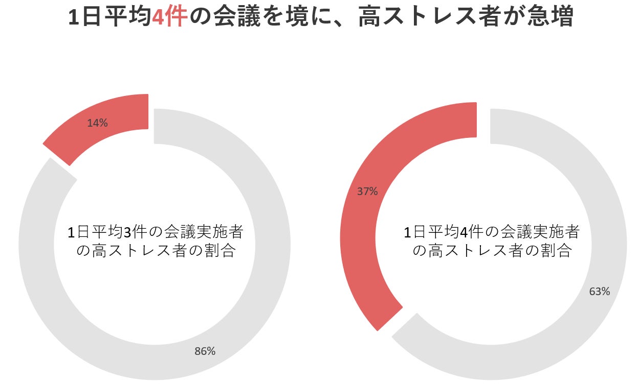 その結果、テレワークの推進で高ストレス者の割合は減少した一方で(※1)、1日4件以上の会議参加を境に、高ストレス者の割合が急増し、37%に達することが明らかになりました。