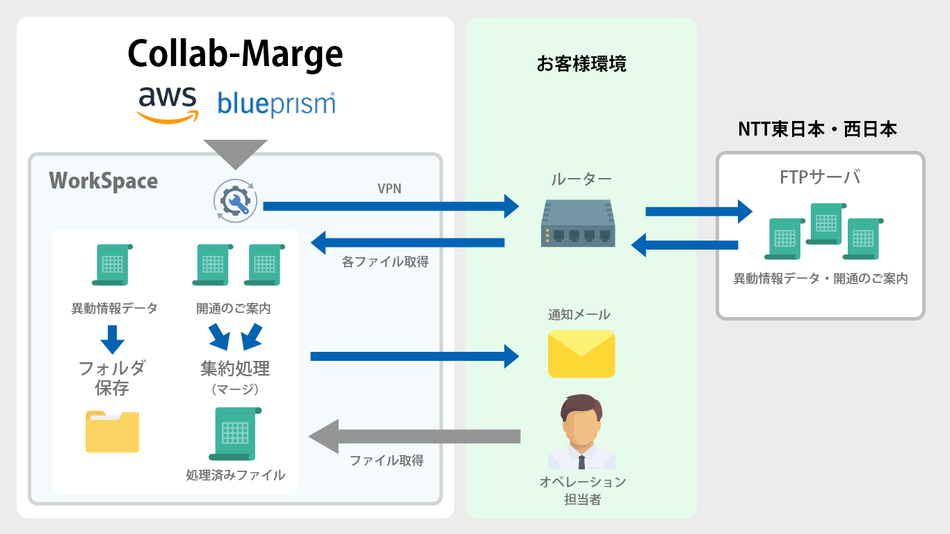 なお、本サービスは高い信頼性と実績のある「Blue Prism」のRPA、「AWS(Amazon Web Services)」のクラウドサービスプラットフォームを採用、データ通信はVPNによるセキュアな方式を実現しています。