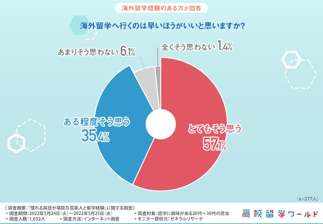 「海外留学へ行くのは早いほうがいいと思いますか?」と尋ねたところ9割以上の方が『とてもそう思う(57.1%)』『ある程度そう思う(35.4%)』と回答しました。