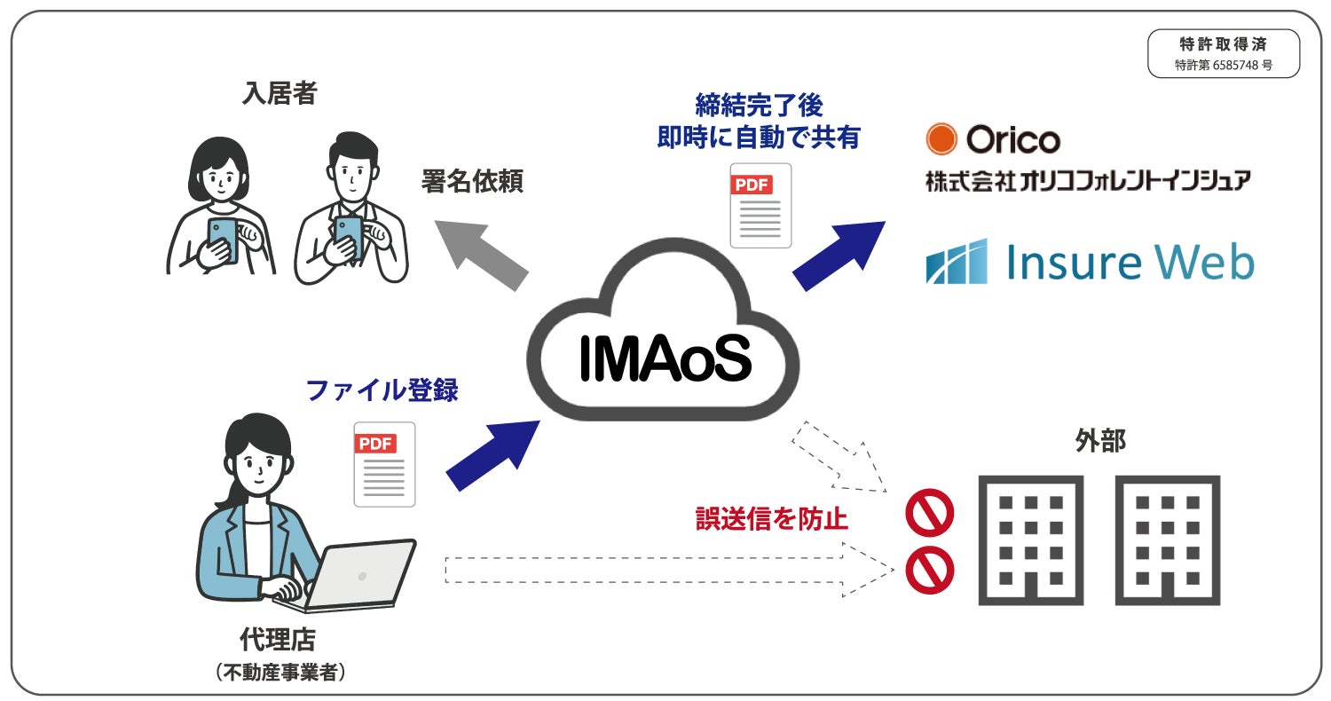 2021年にオリコフォレントインシュアは代理店向けの管理サイト「InsureWeb」の機能強化を行い、家賃債務保証契約書のファイルはIMAoSのデータ連携機能(特許取得済)に準拠したものも提供するようになりました。これにより、代理店がIMAoSで締結した契約書のファイルはリアルタイムでオリコフォレントインシュアの受注センターへ共有されるようになりました。