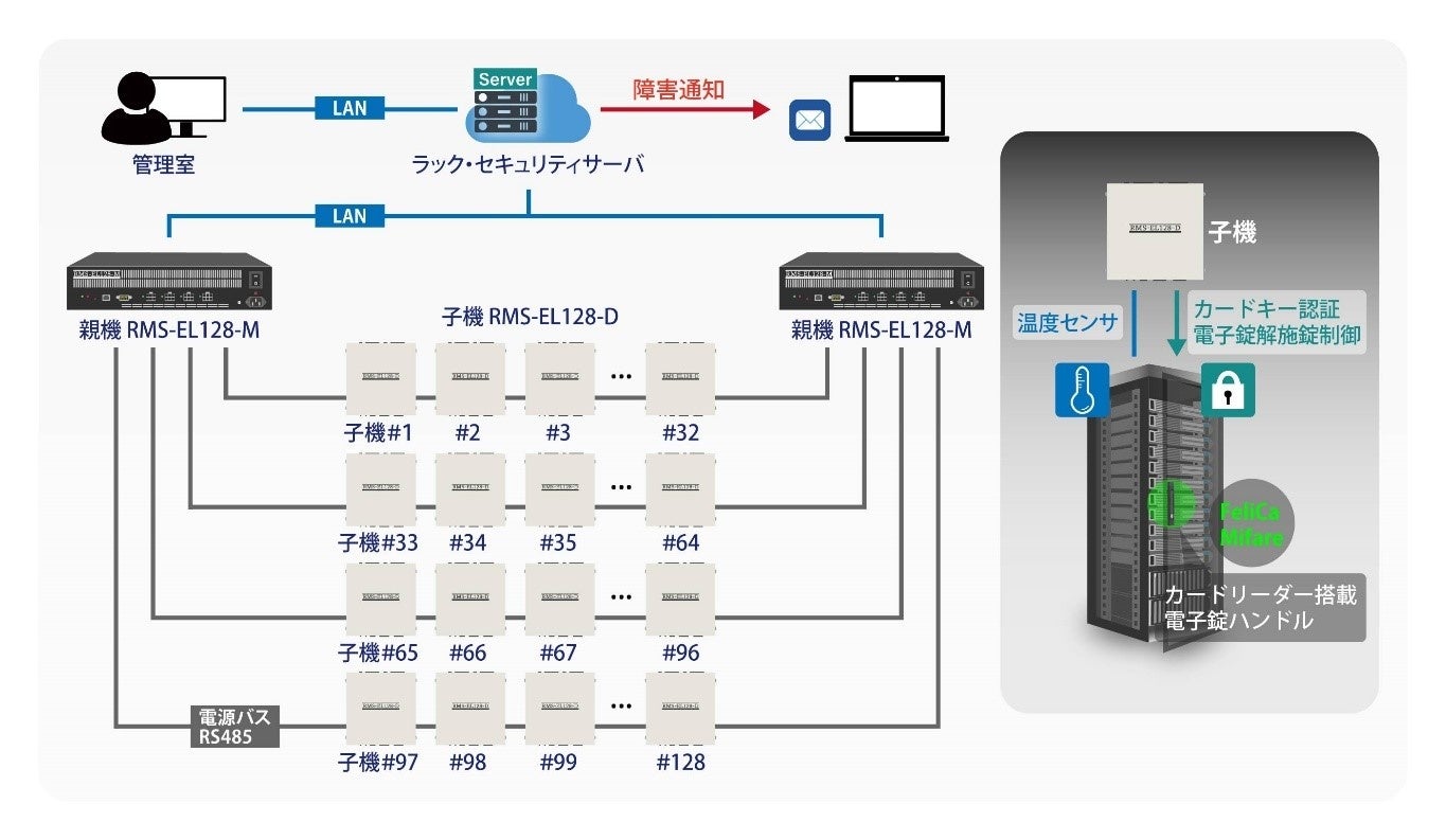 本製品は、管理システムを構築するクラウドサーバー、クラウドサーバーに接続する親機(2台)、そして各ラックに設置しカードリーダー機能と電子錠制御機能を持つ子機(128台)から構成されます。親機から子機の配線の終端に別の親機を接続することで、電源断や故障などによって1台の親機がシステムダウンした場合でも、もう一方の親機がシステムを制御することが可能です。また子機や通信線に不具合が生じた場合でもその他の子機に影響を与えることはありません。冗長化によってカードキーによる電子錠の解錠機能が停止することなく、さらに解錠時の扉開閉のイベントログが取得できない不具合を解消します。