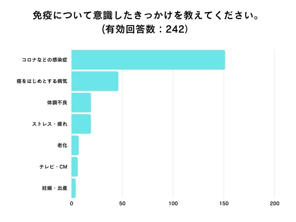 免疫について意識したことがある人の80%以上がコロナを中心とする感染症や癌などの病気がきっかけに