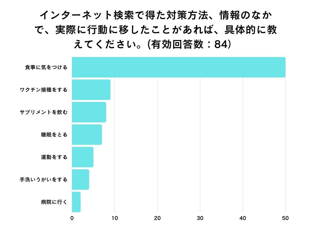 「インターネット検索で得た対策方法、情報のなかで、実際に行動に移したことがあれば、具体的に教えてください。」という質問に対し、「食事に気をつける」と回答した人が59.5%と最も多く、次に「ワクチン接種をする」と回答した人が10.7%となりました。