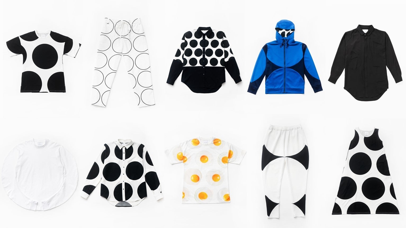 直径9インチの黒いドットを等間隔に配置した長袖シャツです。ドットのサイズは4インチ(白地/黒ドットで裾に黒地切り替えのデザイン)と、9インチ(白地/黒ドット)の2種類があります。