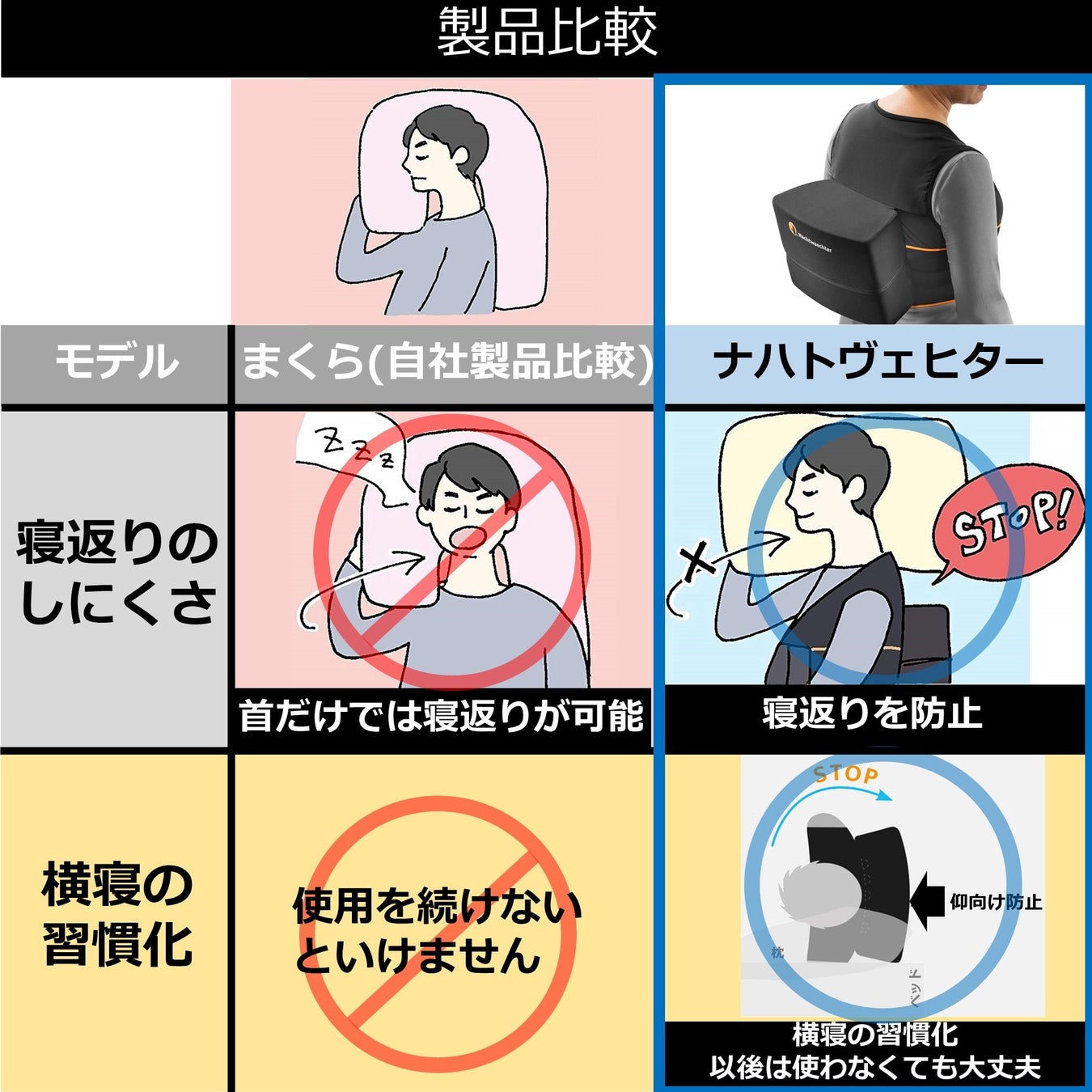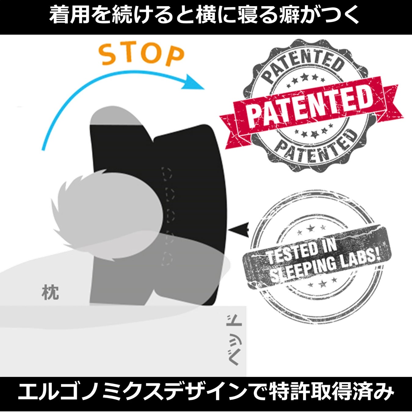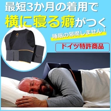 ナハトヴェヒターはドイツで特許を取った新しい横寝枕です。着用すると横に寝る癖がつき、いびきの対策などが期待できます。睡眠中に寝がえりをうとうとしても、背中にある大きな寝返り防止キットが仰向けで寝ることを防止します。