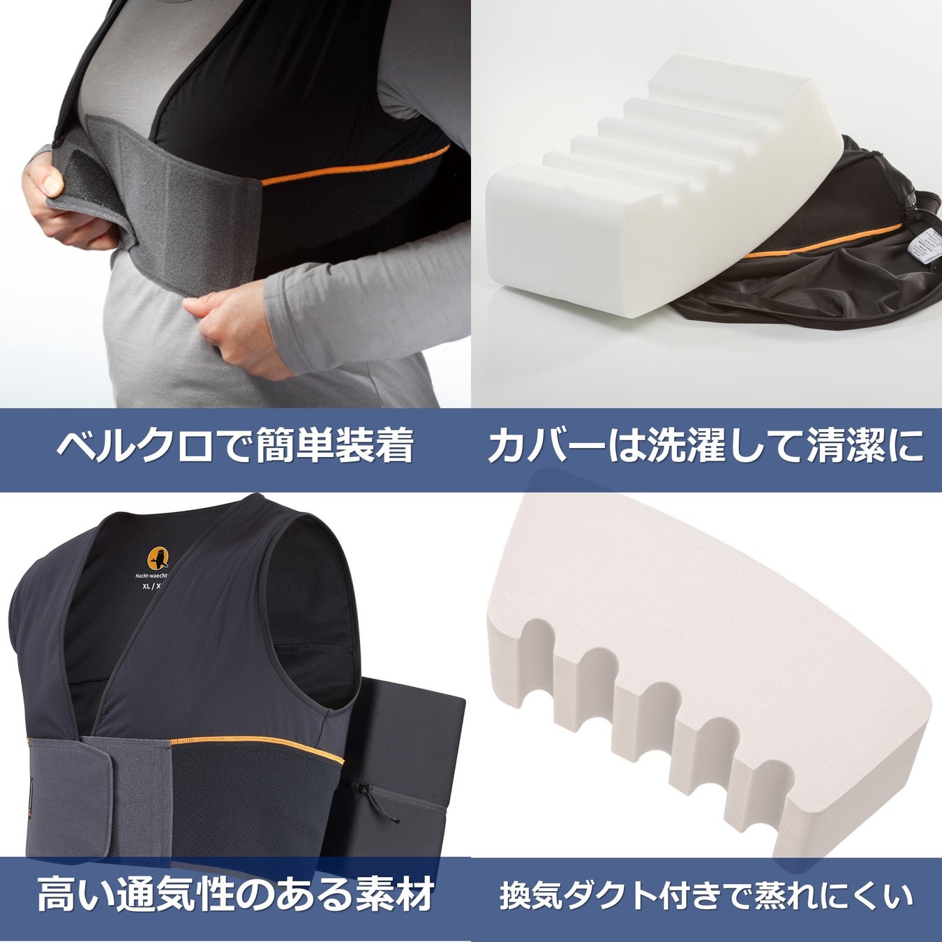 着用はベルクロで簡単にできるようになっており、一人でも着用可能です。カバーは洗濯可能なのでいつでも清潔に使うことができます。