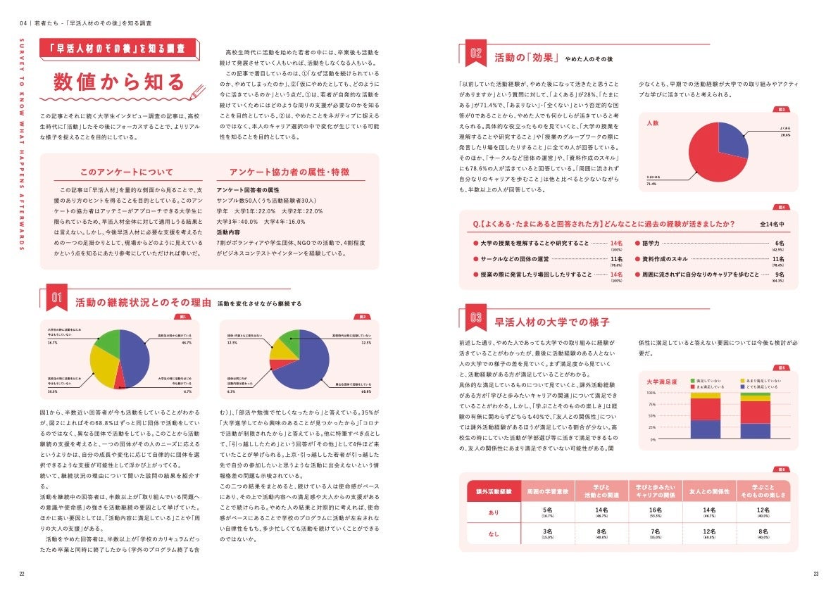 また、アッテミーは今回早期に社会的な活動を行う高校生のその後や、活動スタイルの実態を把握するため、独自にアンケートとインタビュー調査を行いました。その結果、活動を継続できる人はさまざまな団体に移りながら続けていること、学校の外での活動を居場所として捉えている事例があることがわかりました。具体的な数値や語りについてはぜひ本書をご覧ください。