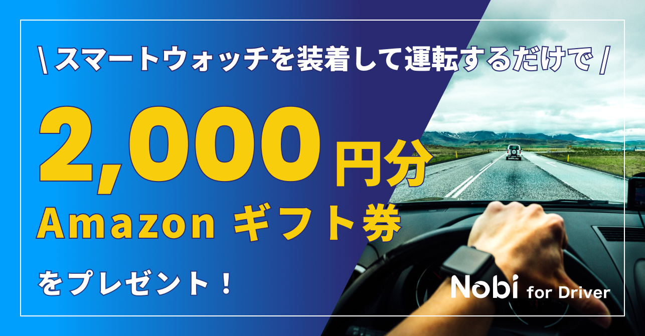 スマートウォッチを活用したドライバーの安全・健康管理ツール「Nobi for Driver」を運営する株式会社enstem(東京都中央区 / 代表取締役 : 山本寛大 / 以下enstem)は、本日8/3(水)から100名限定で専用スマートウォッチ「Nobi Band」を装着しながら車を運転して、アプリで測定中に発生したアラートに対して正誤回答をするだけでAmazonギフト券がもらえる一般モニターの募集を開始しました。