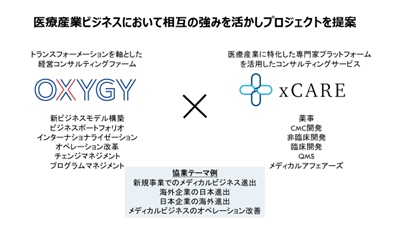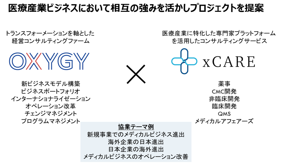 OXYGY社は変革による戦略策定や組織・人財改革、新規事業創出に伴う各種変革プログラムの立上げと、その実行面での伴走及びプログラムマネジメントに強みを持つコンサルティングファームです。そこにxCAREの専門家集団が加わることでヘルスケア関連領域における特異的な薬事や臨床開発等の領域での戦略やビジネスモデルから、オペレーションの改革のための計画から実行までの一連の流れの支援を可能にするというようなシナジーが期待できます。