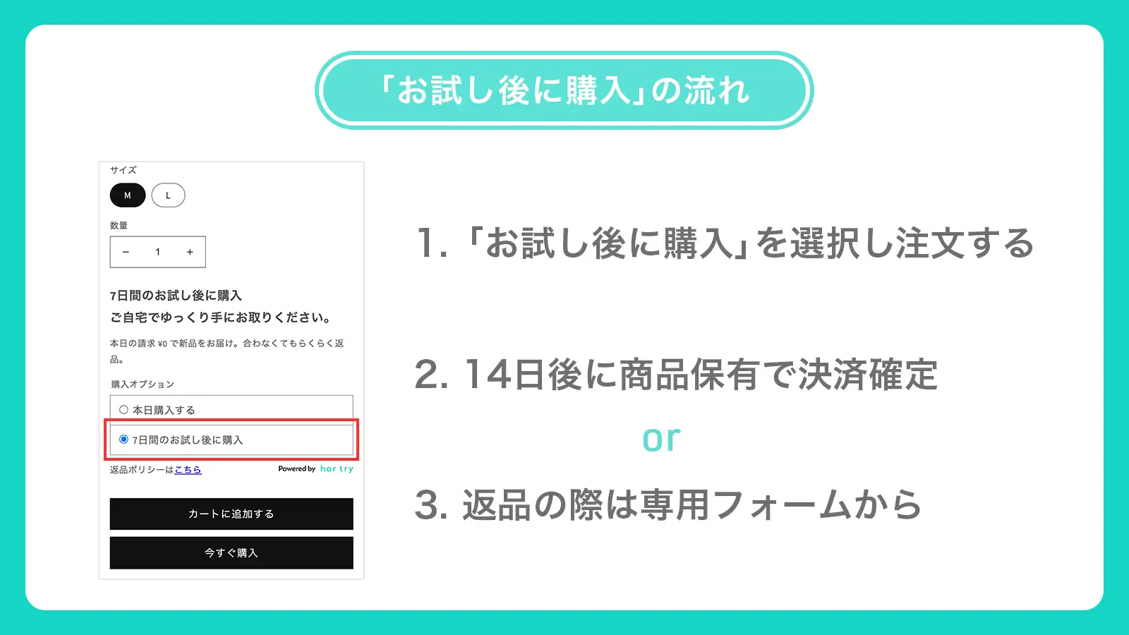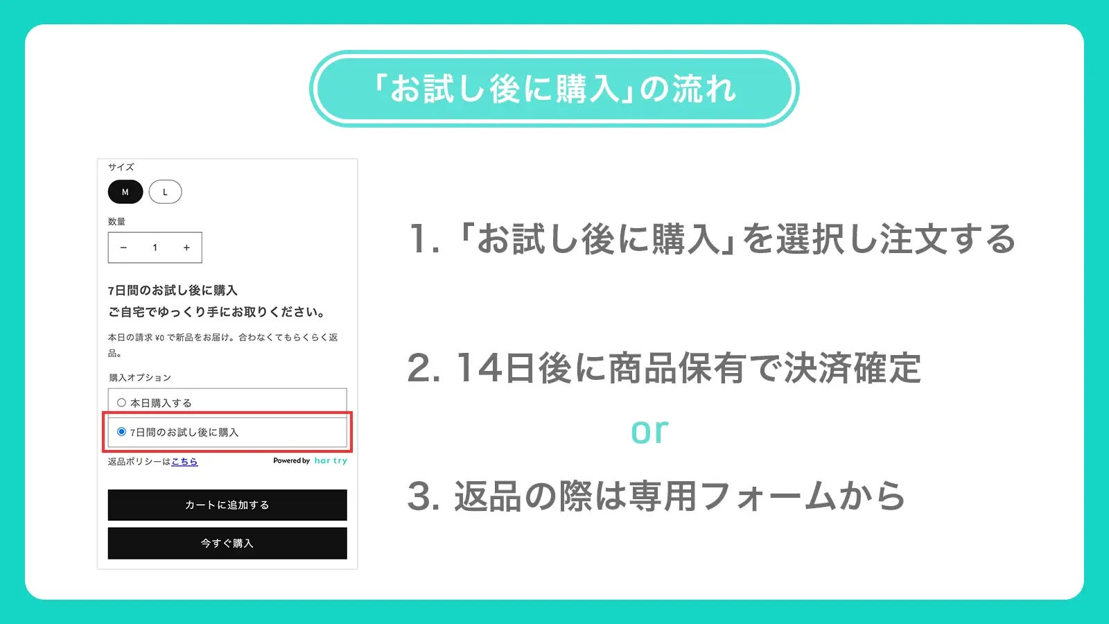 タグ挿入により商品ページに「試して購入する」ボタンを表示します。このボタンからの受注では当日は決済されず、任意のお試し期間が経過した後に自動で決済が確定されます。