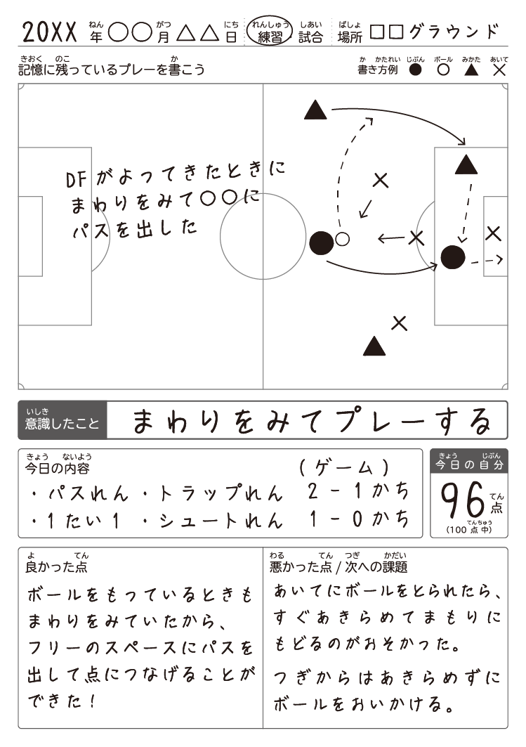 「サッカーノート」は、日々の練習や試合の記録、プレーの振り返りや良かった点、課題などを記録するためのノートです。トップ選手も子どもの頃から実践しているというエピソードもあり、育成年代の成長を支えるアイテムです。