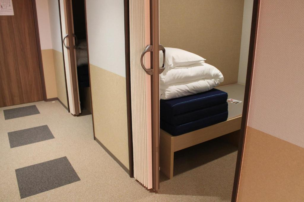 厚めのアコーディオンカーテンで仕切られた、快適な半個室。畳をモチーフにした和風ベッドと、適度な反発性を持ち、体圧分散に優れたマットレスを使用しています。シャワー・お手洗いは共用でのご用意です。