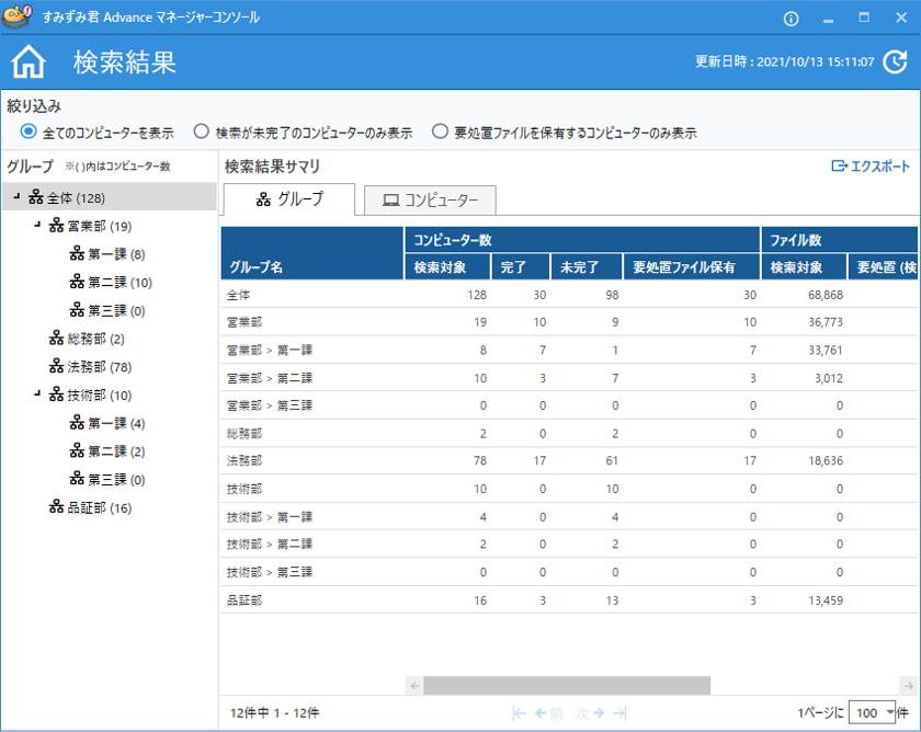 また、管理者は管理者用マネージャー画面でグループ別PCの検索結果一覧を確認できるほか、各PCごとに検索された危険度の高い個人情報ファイルの存在場所も把握することができます。