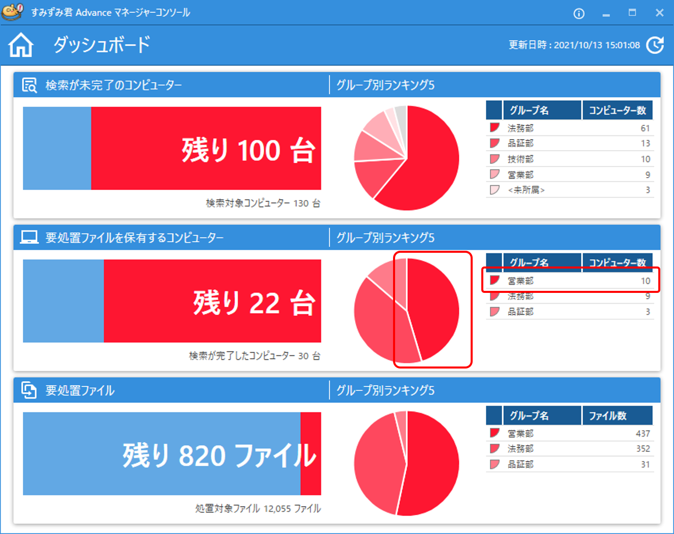 管理者は「すみずみ君 Advance」の管理者用マネージャー画面にグラフィカルに表示されるダッシュボードで暗号化やパスワードロックされていない危険性の高い個人情報ファイルの存在を一目で確認することができるため、個人情報漏洩のリスクを把握することができます。