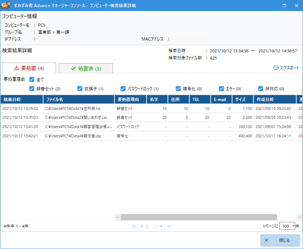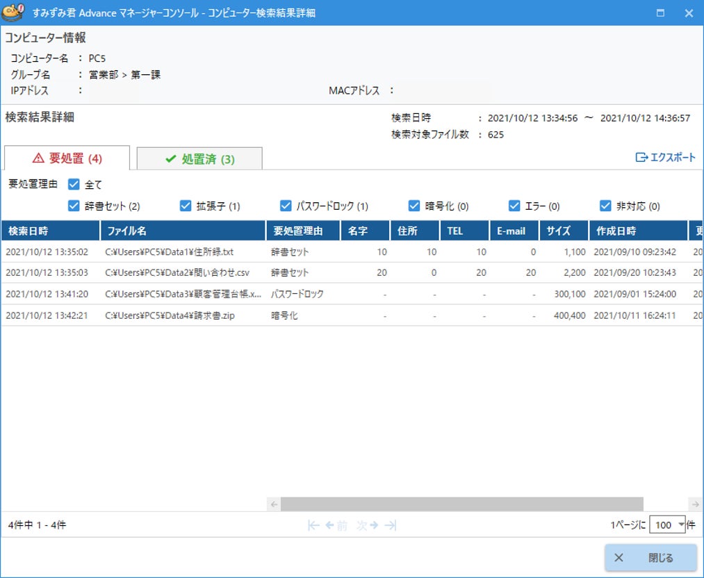 検索された個人情報ファイルは各PCの利用者がファイルの内容に応じで削除、暗号化、パスワードロック、ファイルサーバへの移動などの安全管理措置を行う必要があります。