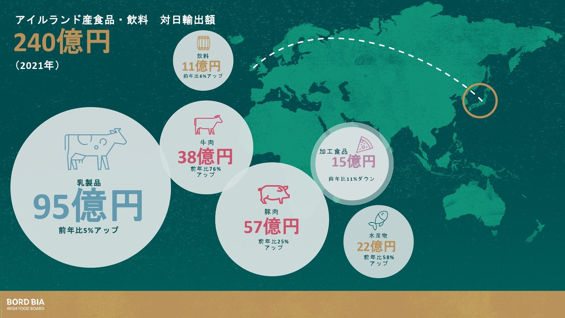 - 主なアイルランド産食品・飲料輸出品目は、乳製品と豚肉、牛肉、水産物、乳製品、アルコールを含む飲料。